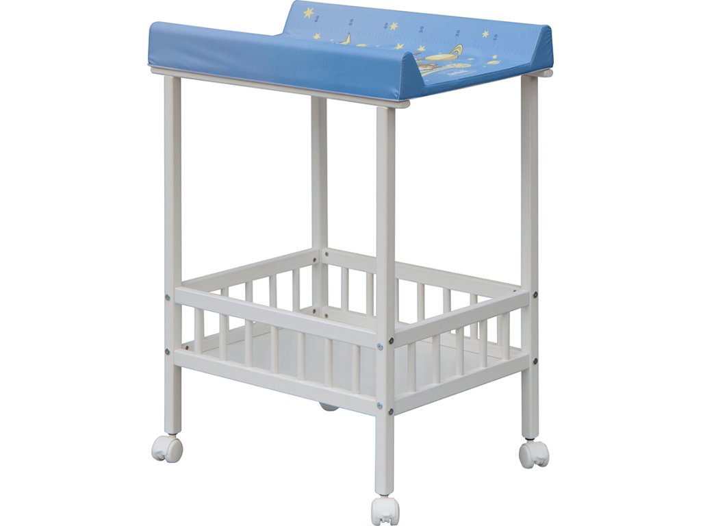 Praktický přebalovací pult se dvěmi policemi z HDF desky. Vrchní přebalovací pult z polyuretanu potažený omyvatelným PVC, vyztužený MDF deskou.