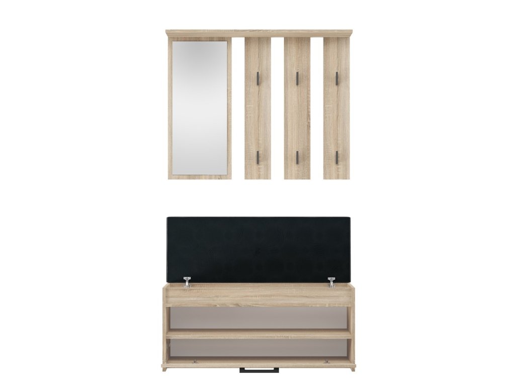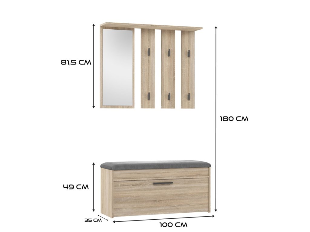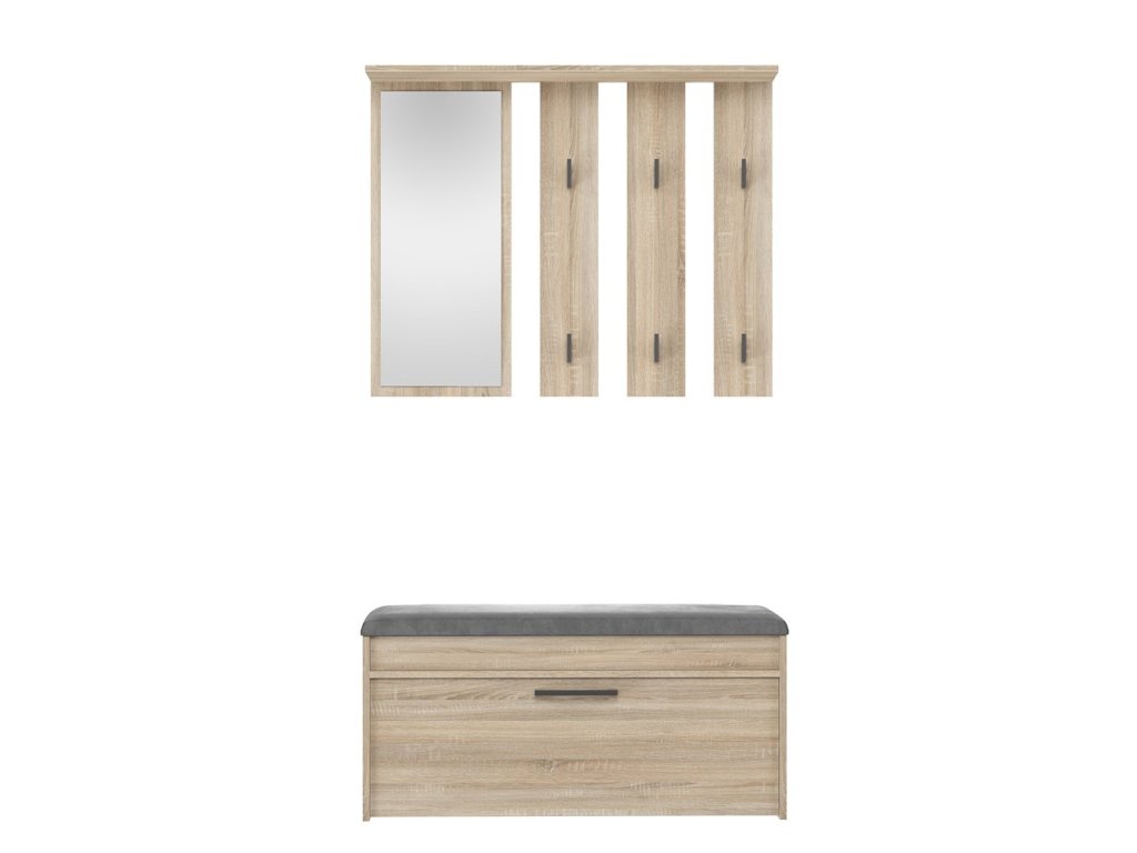 Nadčasová předsíňová sestava Pargas splní očekávání všech, kteří oceňují kombinaci elegance a praktičnosti. Skvěle zapadne do interiérů s minimalistickým či skandinávským charakterem. Sestava se skládá z věšáku se zrcadlem a pohodlného botníku s čalouněným sedákem s výklopnými dvířky. Je vyroben z kvalitního lamina, které je snadno udržovatelné a odolné proti oděru, dlouhou životnost nábytku zajišťují hrany zakončené ABS materiálem.