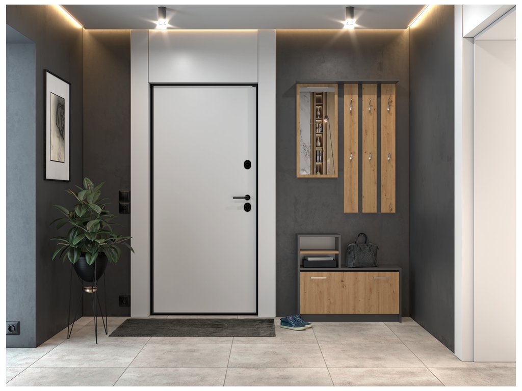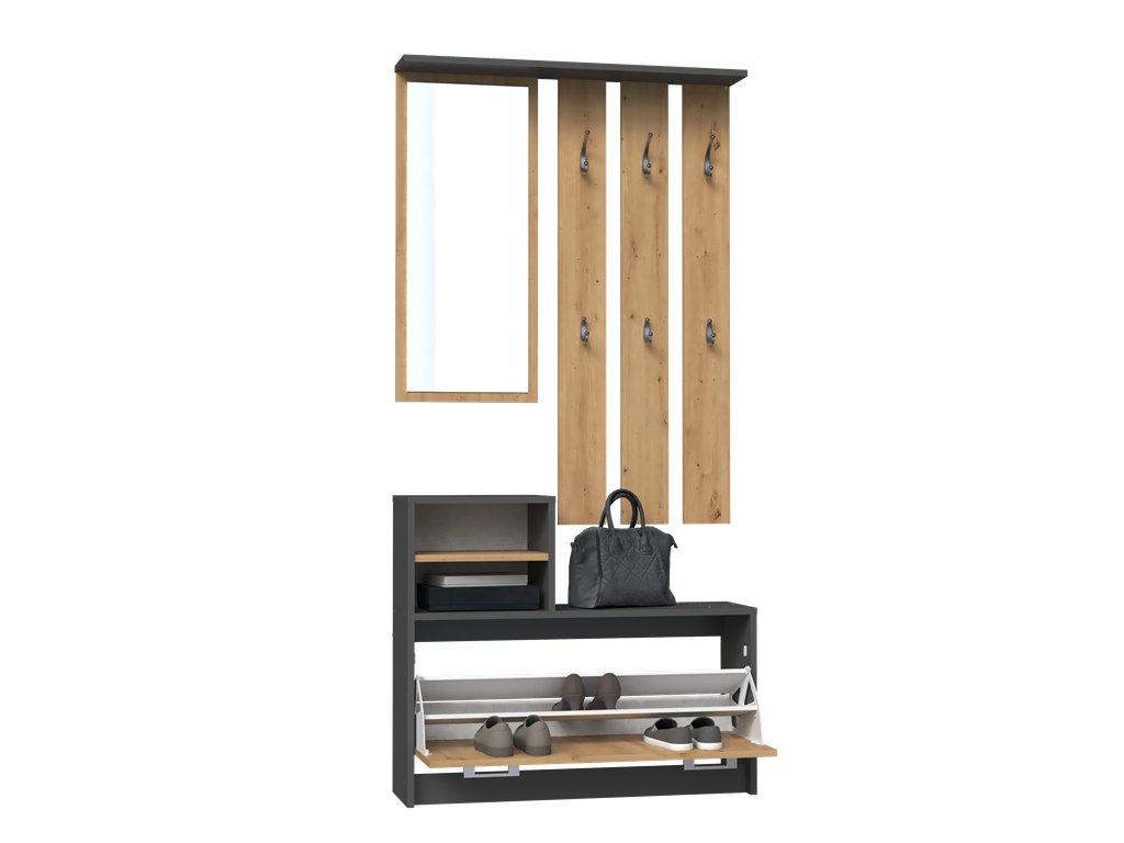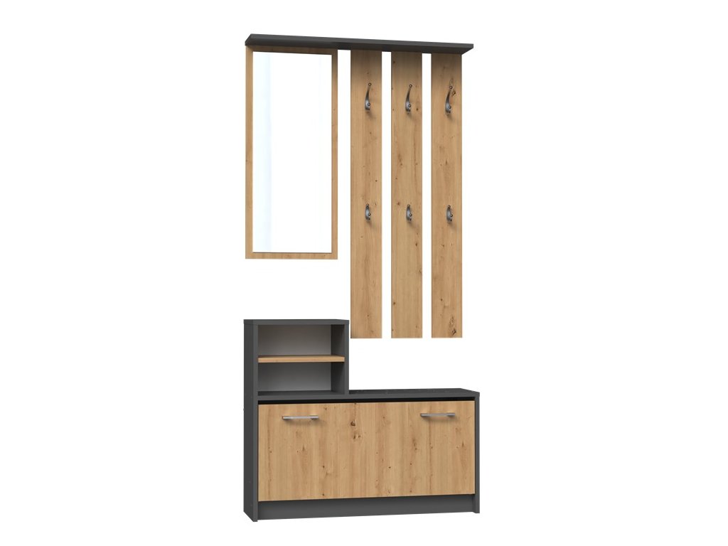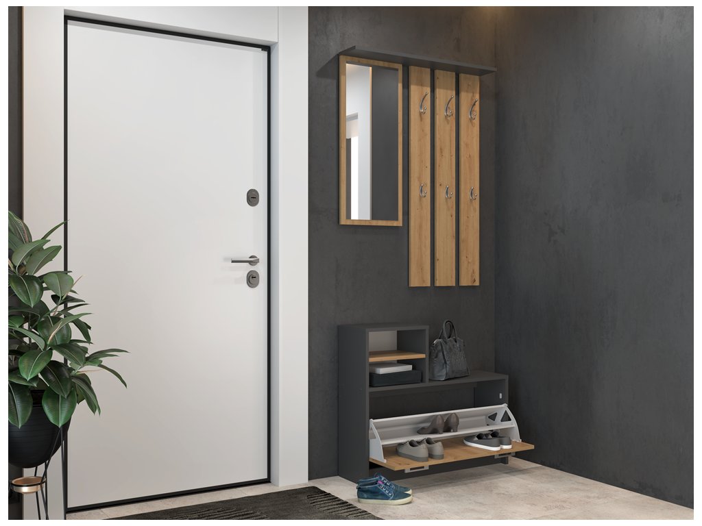 Praktická předsíňová stěna Jantar zútulní každý vstupní prostor vašeho bytu či domu. Je vybavená dostatečným množstvím háčků na oděv, zrcadlem, policemi i funkčním úložným prostorem na boty. Stěna je vyrobena ze snadno udržovatelného lamina, hrany jsou zakončené vysoce odolným ABS materiálem.