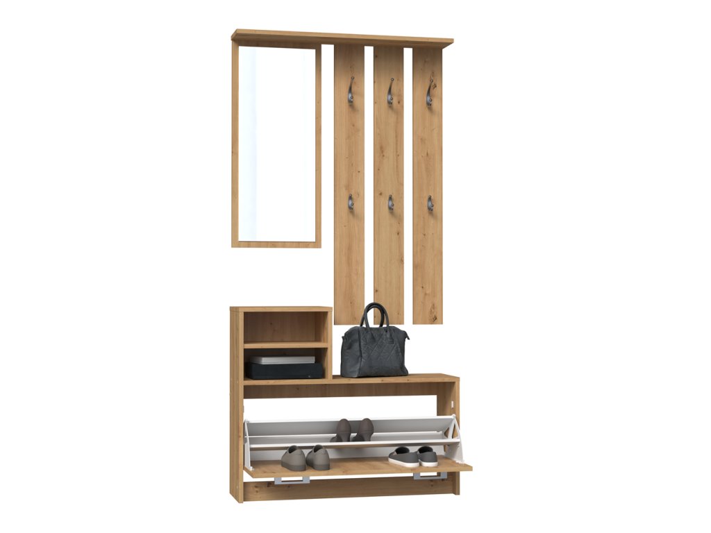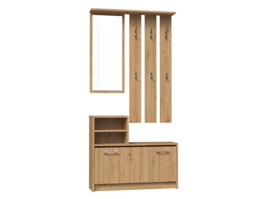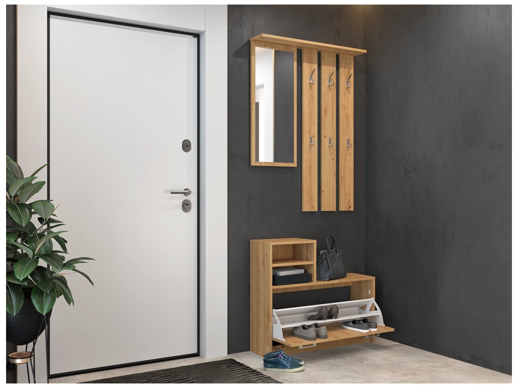 Praktická předsíňová stěna Jantar zútulní každý vstupní prostor vašeho bytu či domu. Je vybavená dostatečným množstvím háčků na oděv, zrcadlem, policemi i funkčním úložným prostorem na boty. Stěna je vyrobena ze snadno udržovatelného lamina, hrany jsou zakončené vysoce odolným ABS materiálem.