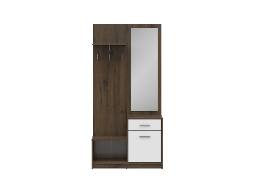 Věšáková stěna Nepo Plus PPK je vybavena praktickou odkládací policí, třemi stříbrnými háčky a šatní tyčí z odolného plastu. Bude ideálním nábytkovým doplňkem do vaší předsíně, kde vytvoří dostatečně veliký úložný prostor. Rozměry stěny: š.146 x v.44 x h.28 cm. Součástí stěny jsou tyto prvky: Zrcadlo - nedílnou součástí předsíně by mělo být také zrcadlo. Zrcadlo Nepo Plus má ideální rozměry v.119 x š.45 cm. Otevřená skříňka (box) - lehce přístupné odkládací místo o rozměrech š.44 x h.30 x v.29 cm. Uzavřená skříňka - za otevíracími dvířky Vám bude k dispozici úložný prostor s rozměry š.39 x h.30 x v.40 cm. Dvířka skříňky se otevírají vpravo. Úchytka je stříbrná z tvrzeného plastu. Zásuvka - praktická zásuvka by neměla chybět. Ke snadné manipulaci dopomáhají kovové pojezdy i stříbrná úchytka z tvrzeného plastu. Využitelné rozměry: š.39 x h.25 x v.10 cm. Předsíňová stěna Nepo Plus je vyrobena z 1,6 cm silného lamina v dekoru Dub ušlechtilý/bílá. Montáž zvládnete snadno. Dodáváno v demontu.