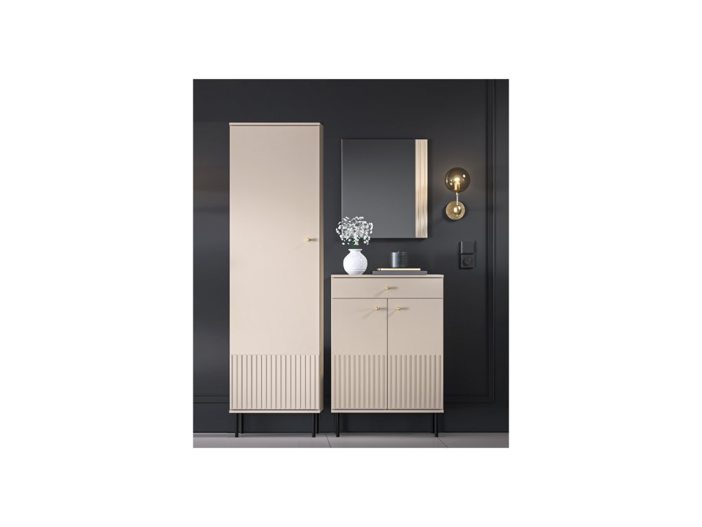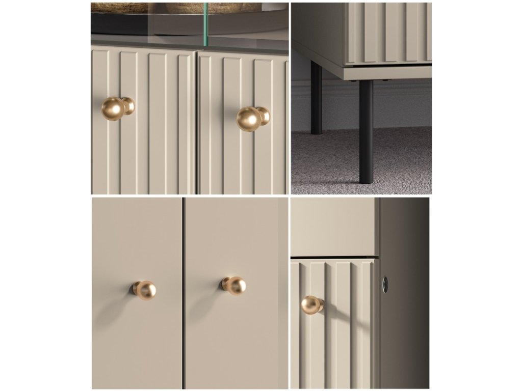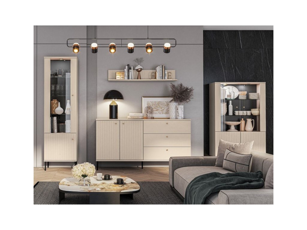 Nábytek z kolekce Sophie je perfektní volbou do moderního obývacího pokoje, ložnice nebo haly. Díky systému složenému z mnoha prvků si můžete zařídit svůj vysněný interiér. Kašmírový dekor je originální a nadčasová barva nazývaná nová bílá. Frézovaná čela z MDF zdůrazňují sofistikovanost a eleganci celé kolekce. Decentní černé nohy dodávají tvarům působivou lehkost. Vrcholem, který navíc umocňuje estetiku veškerého nábytku Sophie, jsou úchytky z broušeného kovu zlaté barvy.