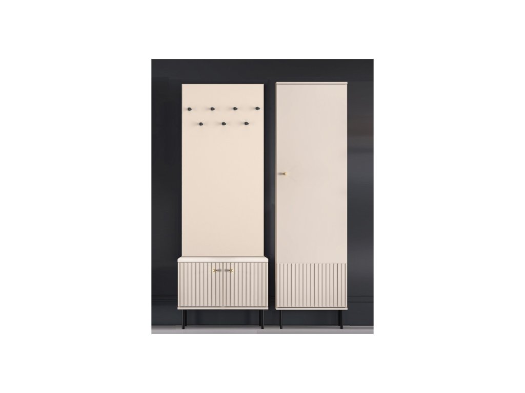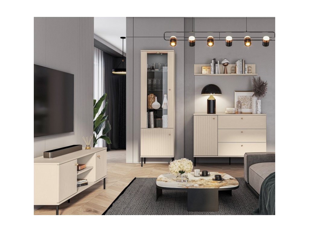 Nábytek z kolekce Sophie je perfektní volbou do moderního obývacího pokoje, ložnice nebo haly. Díky systému složenému z mnoha prvků si můžete zařídit svůj vysněný interiér. Kašmírový dekor je originální a nadčasová barva nazývaná nová bílá. Frézovaná čela z MDF zdůrazňují sofistikovanost a eleganci celé kolekce. Decentní černé nohy dodávají tvarům působivou lehkost. Vrcholem, který navíc umocňuje estetiku veškerého nábytku Sophie, jsou úchytky z broušeného kovu zlaté barvy.