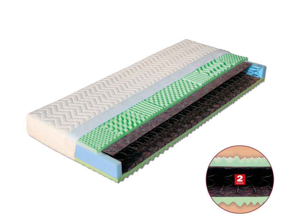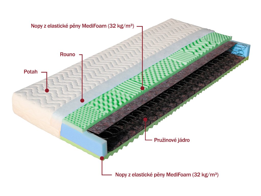 Kvalitní pružinová sedmizónová matrace. Nosné vrstvy matrace tvoří elastická pěna MediFoam (32 kg/m³) střední tuhosti, tvarovaná do masážních nopů. Použití nopů u matrace je velmi prospěšné pro prokrvení pokožky a uvolnění svalstva v průběhu spánku. Díky pružinovému jádru je zajištěno dokonalé provzdušnění matrace. Tato matrace je vhodná pro širokou škálu uživatelů. Pružinové matrace je možné uložit na rovnou plochu, ale i na pevný lamelový rošt. Celková výška matrace cca 20 cm.
