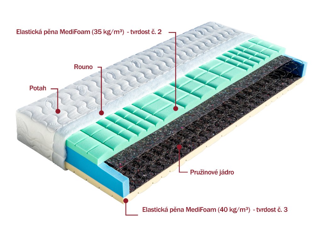 Velmi kvalitní pružinová matrace vrstvená elastickými pěnami MediFoam různých objemových hmotností (35 a 40 kg/m³) rozdělených do 7 anatomických zón s antidekubitním průřezem. Výška jádra poskytuje uživateli komfort, pevnou anatomickou oporu páteře a zároveň zajišťuje vysokou vzdušnost matrace. Pružinové matrace je možné uložit na pevnou desku, ale i na pevný lamelový rošt.