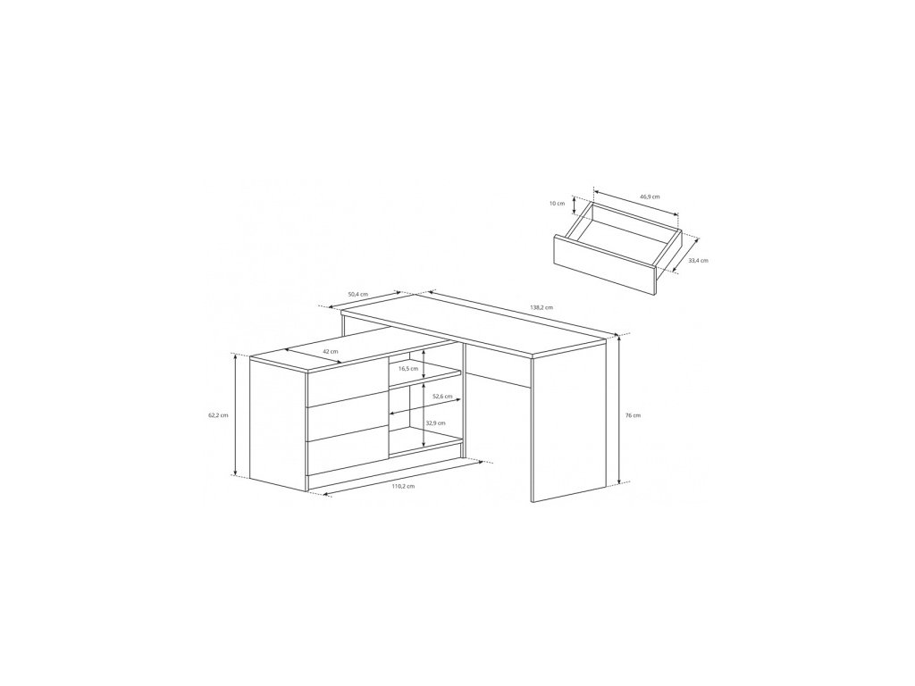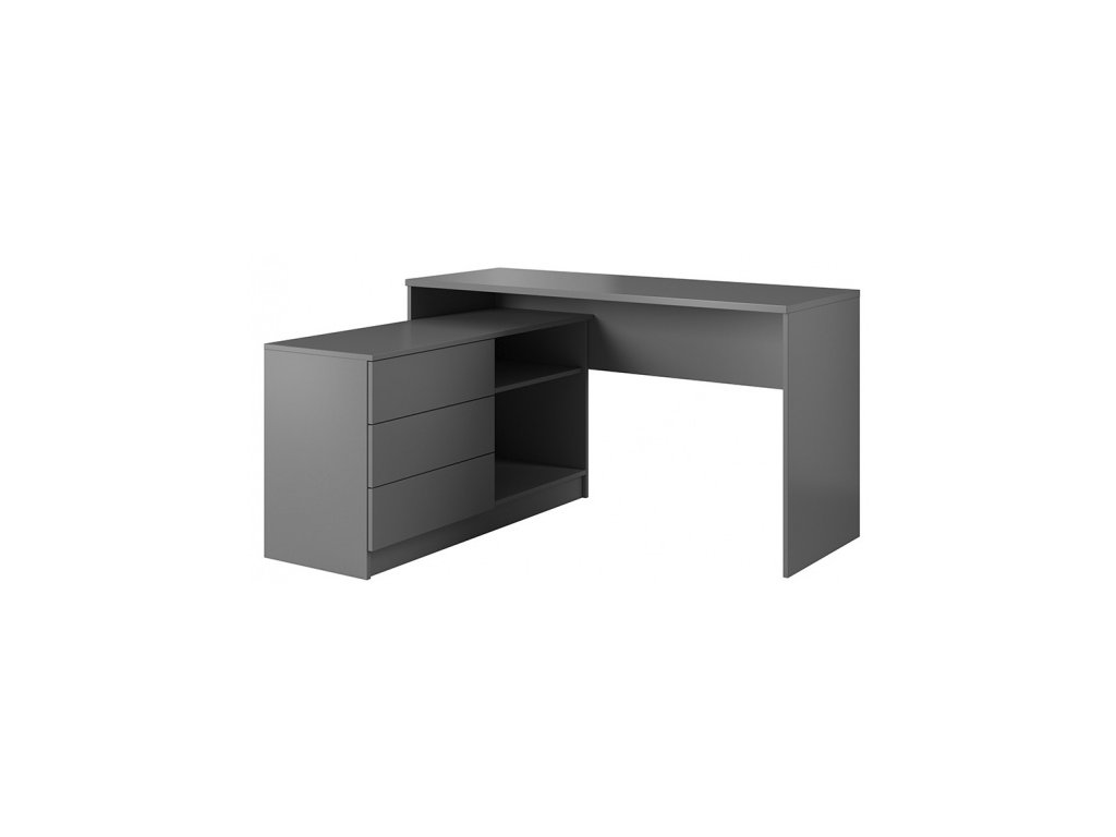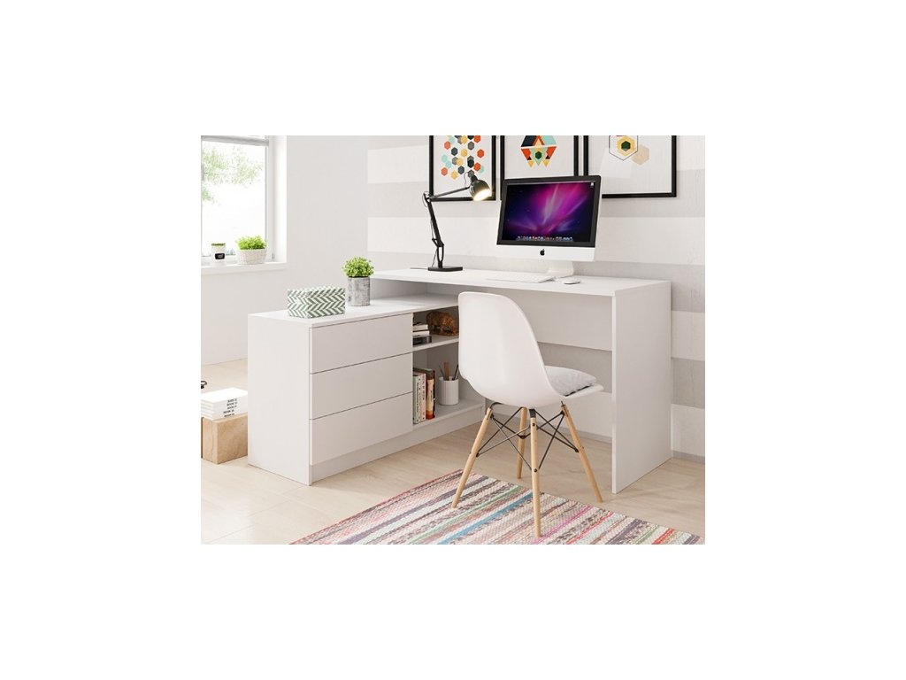 Velmi praktický a moderní psací stůl. Hodí se do pokoje pro studenta nebo pro toho, kdo ocení velký prostor při práci. Stůl je vybaven komodou se šuplíky a otevřeným prostorem s policí. Stůl je univerzální.