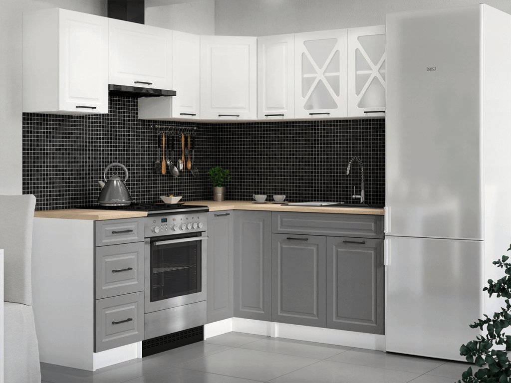 Kuchyňská linka Astra je vyrobená ve venkovském stylu, který se hodí do kuchyně v paneláku i v rodinném domě. Tento styl má jedinečnou schopnost proměnit Vaši kuchyň v útulnou a zároveň funkční místnost, kde bude radost vařit i péct. Rohová kuchyňská linka Astra nabízí dostatek úložného i pracovního prostoru. Kuchyňské skříňky jsou samostatné, takže si je můžete sestavit podle potřeby tak, jak Vám to vyhovuje. Korpusy skříněk jsou vyrobené z lamina 18 mm s hranami ABS a dvířka jsou MDF 16mm. Všechny skříňky jsou dodávány v demontu. Součástí balení je montážní plánek včetně všech potřebných spojovacích prvků. Cena je uvedena za sestavu vyobrazenou na úvodní fotografii BEZ PRACOVNÍ DESKY, s úchytkami, které jsou vyobrazeny v doplňkových fotografiích. Pracovní desku lze dokoupit nad každou skříňku zvlášť podle její šíře. Vyobrazené spotřebiče, dřez, baterie, doplňky a dekorace nejsou v ceně. Kuchyň bude dodaná s bílými korpusy a dvířky v dekóru bílá a šedá.