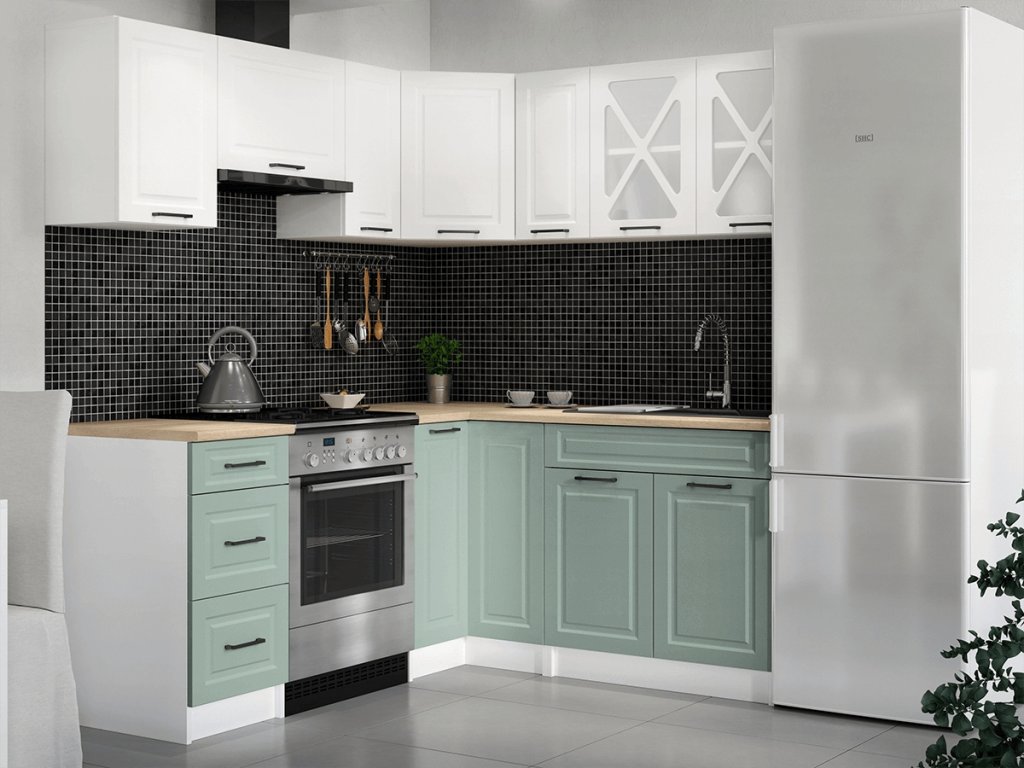 Kuchyňská linka Astra je vyrobená ve venkovském stylu, který se hodí do kuchyně v paneláku i v rodinném domě. Tento styl má jedinečnou schopnost proměnit Vaši kuchyň v útulnou a zároveň funkční místnost, kde bude radost vařit i péct. Rohová kuchyňská linka Astra nabízí dostatek úložného i pracovního prostoru. Kuchyňské skříňky jsou samostatné, takže si je můžete sestavit podle potřeby tak, jak Vám to vyhovuje. Korpusy skříněk jsou vyrobené z lamina 18 mm s hranami ABS a dvířka jsou MDF 16mm. Všechny skříňky jsou dodávány v demontu. Součástí balení je montážní plánek včetně všech potřebných spojovacích prvků. Cena je uvedena za sestavu vyobrazenou na úvodní fotografii BEZ PRACOVNÍ DESKY, s úchytkami, které jsou vyobrazeny v doplňkových fotografiích. Pracovní desku lze dokoupit nad každou skříňku zvlášť podle její šíře. Vyobrazené spotřebiče, dřez, baterie, doplňky a dekorace nejsou v ceně. Kuchyň bude dodaná s bílými korpusy a dvířky v dekóru bílá a fjord-světle zelená.
