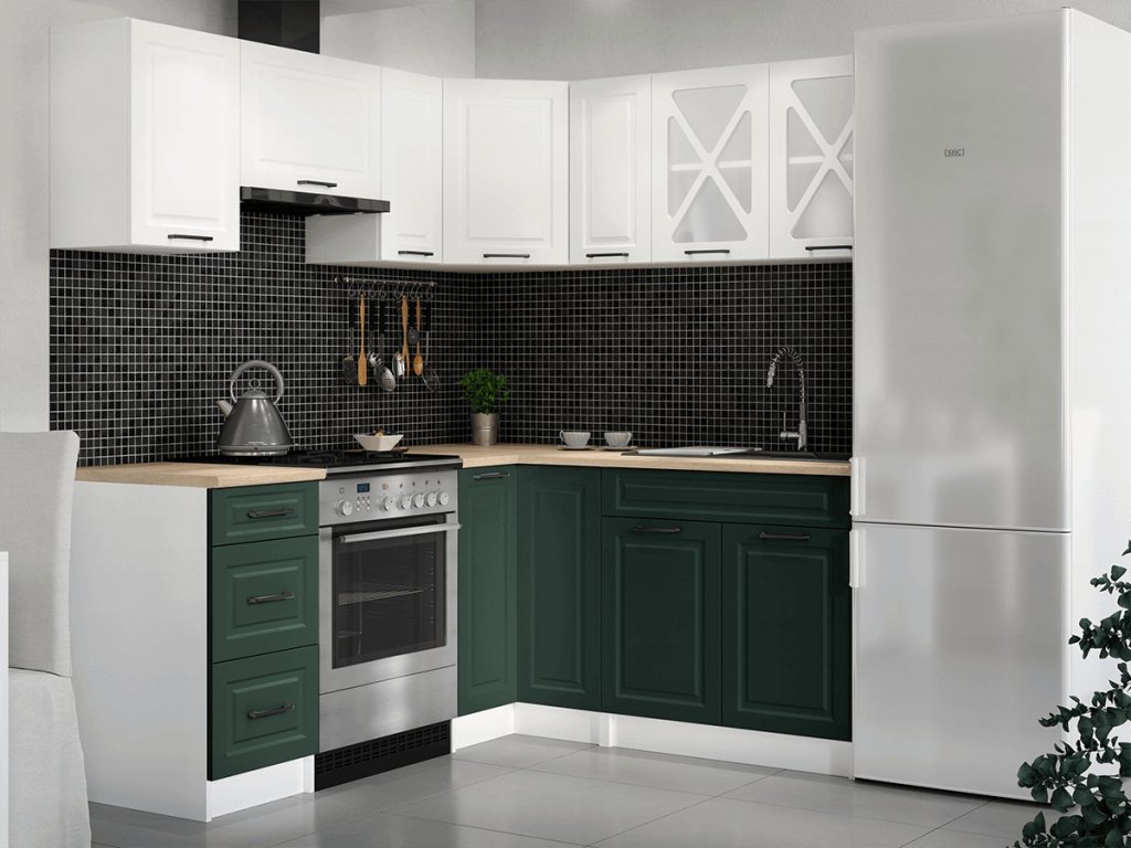 Kuchyňská linka Astra je vyrobená ve venkovském stylu, který se hodí do kuchyně v paneláku i v rodinném domě. Tento styl má jedinečnou schopnost proměnit Vaši kuchyň v útulnou a zároveň funkční místnost, kde bude radost vařit i péct. Rohová kuchyňská linka Astra nabízí dostatek úložného i pracovního prostoru. Kuchyňské skříňky jsou samostatné, takže si je můžete sestavit podle potřeby tak, jak Vám to vyhovuje. Korpusy skříněk jsou vyrobené z lamina 18 mm s hranami ABS a dvířka jsou MDF 16mm. Všechny skříňky jsou dodávány v demontu. Součástí balení je montážní plánek včetně všech potřebných spojovacích prvků. Cena je uvedena za sestavu vyobrazenou na úvodní fotografii BEZ PRACOVNÍ DESKY, s úchytkami, které jsou vyobrazeny v doplňkových fotografiích. Pracovní desku lze dokoupit nad každou skříňku zvlášť podle její šíře. Vyobrazené spotřebiče, dřez, baterie, doplňky a dekorace nejsou v ceně. Kuchyň bude dodaná s bílými korpusy a dvířky v dekóru bílá a tmavě zelená.