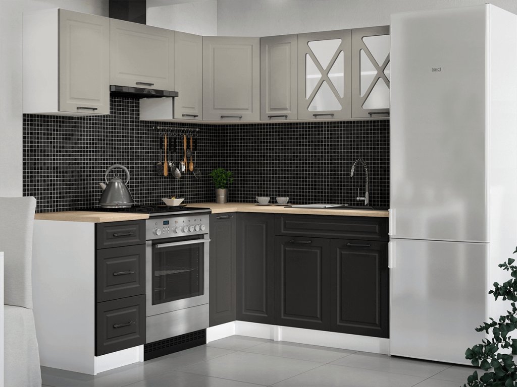 Kuchyňská linka Astra je vyrobená ve venkovském stylu, který se hodí do kuchyně v paneláku i v rodinném domě. Tento styl má jedinečnou schopnost proměnit Vaši kuchyň v útulnou a zároveň funkční místnost, kde bude radost vařit i péct. Rohová kuchyňská linka Astra nabízí dostatek úložného i pracovního prostoru. Kuchyňské skříňky jsou samostatné, takže si je můžete sestavit podle potřeby tak, jak Vám to vyhovuje. Korpusy skříněk jsou vyrobené z lamina 18 mm s hranami ABS a dvířka jsou MDF 16mm. Všechny skříňky jsou dodávány v demontu. Součástí balení je montážní plánek včetně všech potřebných spojovacích prvků. Cena je uvedena za sestavu vyobrazenou na úvodní fotografii BEZ PRACOVNÍ DESKY, s úchytkami, které jsou vyobrazeny v doplňkových fotografiích. Pracovní desku lze dokoupit nad každou skříňku zvlášť podle její šíře. Vyobrazené spotřebiče, dřez, baterie, doplňky a dekorace nejsou v ceně. Kuchyň bude dodaná s bílými korpusy a dvířky v dekóru světle šedá a grafit.