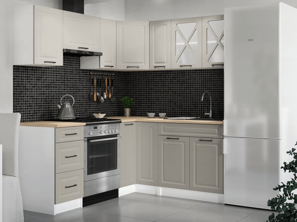 Kuchyňská linka Astra je vyrobená ve venkovském stylu, který se hodí do kuchyně v paneláku i v rodinném domě. Tento styl má jedinečnou schopnost proměnit Vaši kuchyň v útulnou a zároveň funkční místnost, kde bude radost vařit i péct. Rohová kuchyňská linka Astra nabízí dostatek úložného i pracovního prostoru. Kuchyňské skříňky jsou samostatné, takže si je můžete sestavit podle potřeby tak, jak Vám to vyhovuje. Korpusy skříněk jsou vyrobené z lamina 18 mm s hranami ABS a dvířka jsou MDF 16mm. Všechny skříňky jsou dodávány v demontu. Součástí balení je montážní plánek včetně všech potřebných spojovacích prvků. Cena je uvedena za sestavu vyobrazenou na úvodní fotografii BEZ PRACOVNÍ DESKY, s úchytkami, které jsou vyobrazeny v doplňkových fotografiích. Pracovní desku lze dokoupit nad každou skříňku zvlášť podle její šíře. Vyobrazené spotřebiče, dřez, baterie, doplňky a dekorace nejsou v ceně. Kuchyň bude dodaná s bílými korpusy a šedými dvířky.