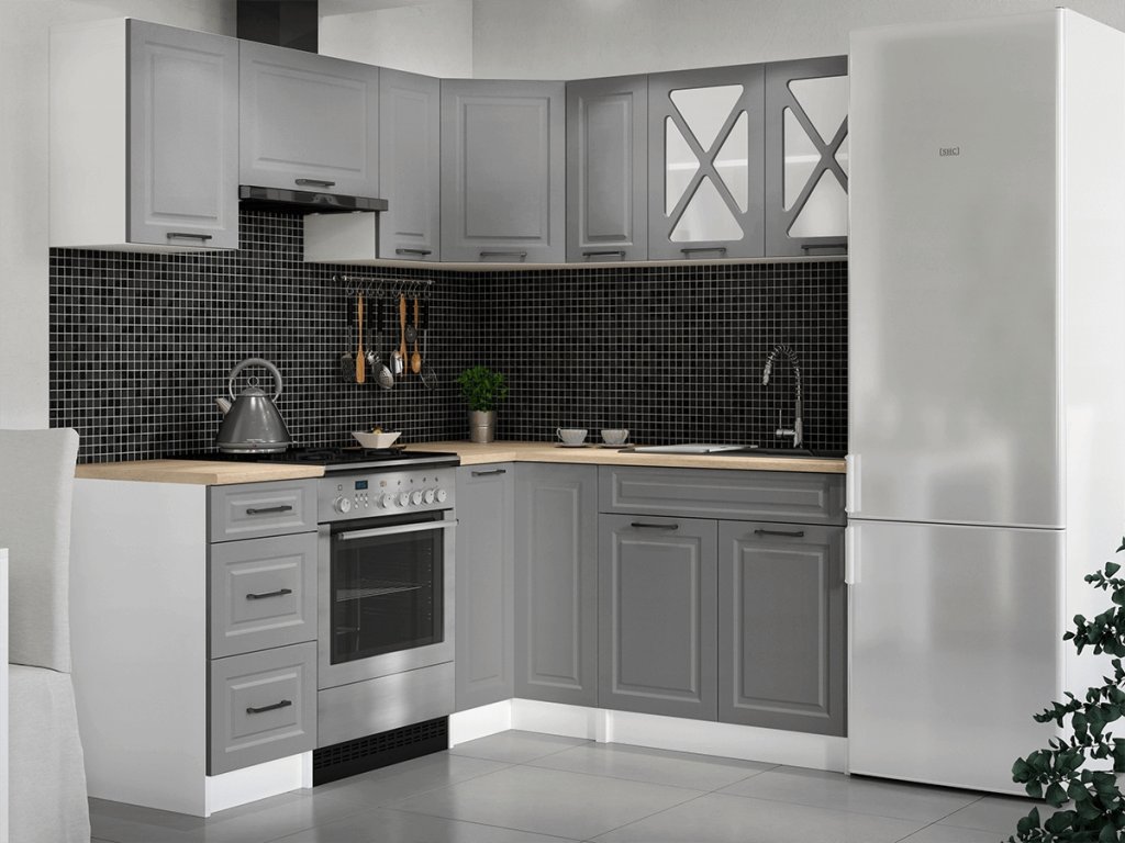 Kuchyňská linka Astra je vyrobená ve venkovském stylu, který se hodí do kuchyně v paneláku i v rodinném domě. Tento styl má jedinečnou schopnost proměnit Vaši kuchyň v útulnou a zároveň funkční místnost, kde bude radost vařit i péct. Rohová kuchyňská linka Astra nabízí dostatek úložného i pracovního prostoru. Kuchyňské skříňky jsou samostatné, takže si je můžete sestavit podle potřeby tak, jak Vám to vyhovuje. Korpusy skříněk jsou vyrobené z lamina 18 mm s hranami ABS a dvířka jsou MDF 16mm. Všechny skříňky jsou dodávány v demontu. Součástí balení je montážní plánek včetně všech potřebných spojovacích prvků. Cena je uvedena za sestavu vyobrazenou na úvodní fotografii BEZ PRACOVNÍ DESKY, s úchytkami, které jsou vyobrazeny v doplňkových fotografiích. Pracovní desku lze dokoupit nad každou skříňku zvlášť podle její šíře. Vyobrazené spotřebiče, dřez, baterie, doplňky a dekorace nejsou v ceně. Kuchyň bude dodaná s bílými korpusy a dvířky v dekóru šedá.