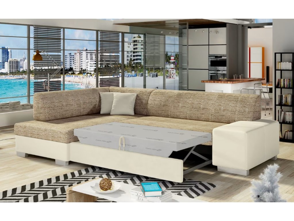 Stylová, multifunkční rohová sedací souprava se stabilní konstrukcí ve tvaru L. Maximální pohodlí zaručí pěna, ze které je sedák vyroben. Vlnová pružina v kombinaci s pěnou T30 na jedné straně zaručuje, že nevzniknou žádné deformace a nevzhledné prohlubně a na druhé straně správné držení těla během odpočinku. Při výběru rohové sedací soupravy Fabio stojí za pozornost její geometrický, newyorský design, stylové dekorační polštáře, které jsou součástí dodávky.