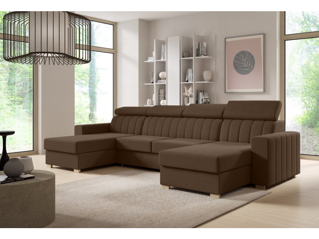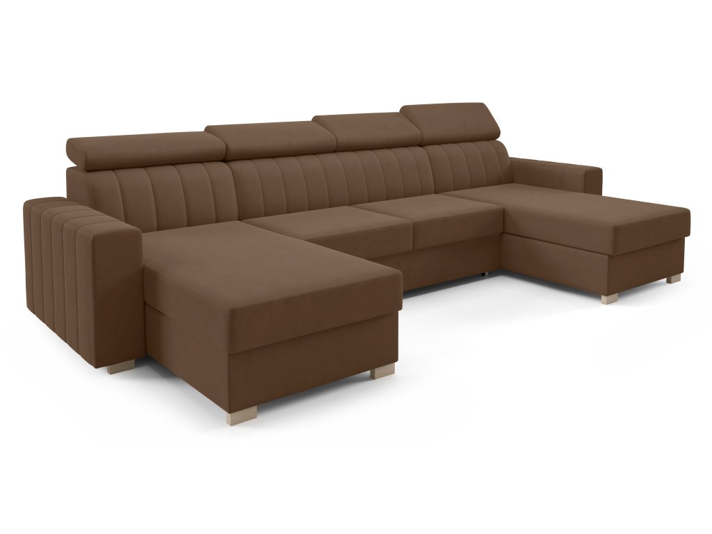 Moderní sedací souprava ve tvaru U zaujme svým zpracováním. Krásné vertikální pošití opěradel a boků zajišťuje vysokou atraktivnost sedačky. Nastavitelné opěrky hlavy zvyšují konformní posezení.