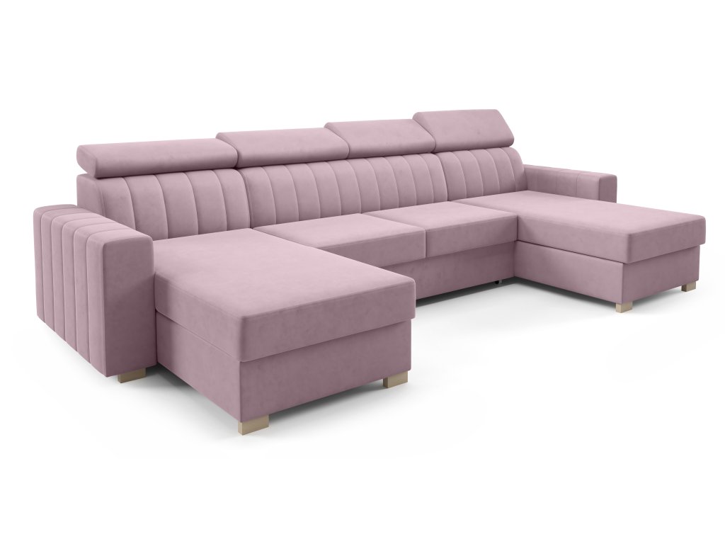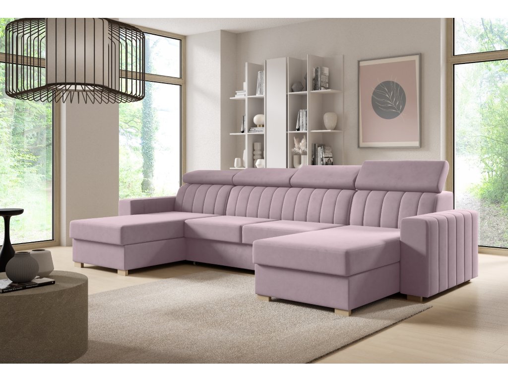 Moderní sedací souprava ve tvaru U zaujme svým zpracováním. Krásné vertikální pošití opěradel a boků zajišťuje vysokou atraktivnost sedačky. Nastavitelné opěrky hlavy zvyšují konformní posezení.