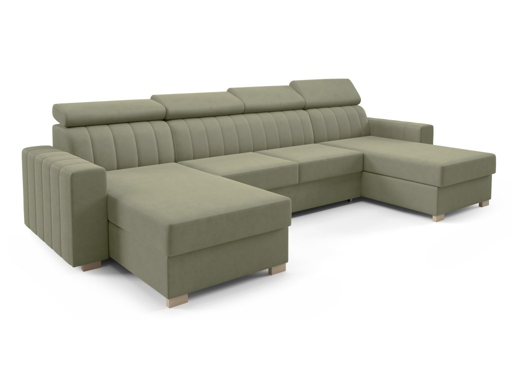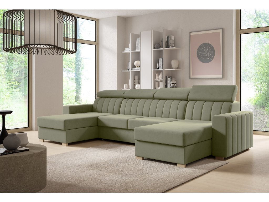 Moderní sedací souprava ve tvaru U zaujme svým zpracováním. Krásné vertikální pošití opěradel a boků zajišťuje vysokou atraktivnost sedačky. Nastavitelné opěrky hlavy zvyšují konformní posezení.