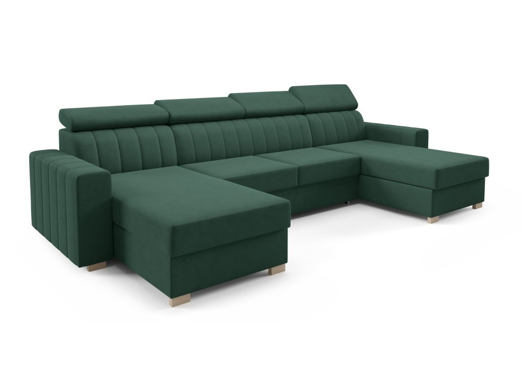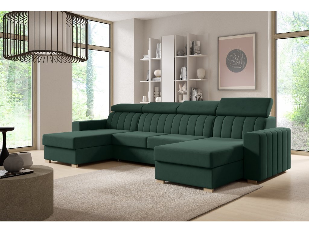 Moderní sedací souprava ve tvaru U zaujme svým zpracováním. Krásné vertikální pošití opěradel a boků zajišťuje vysokou atraktivnost sedačky. Nastavitelné opěrky hlavy zvyšují konformní posezení.