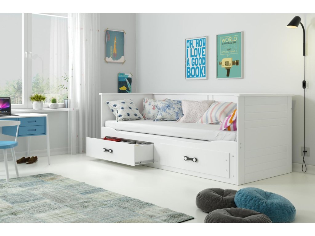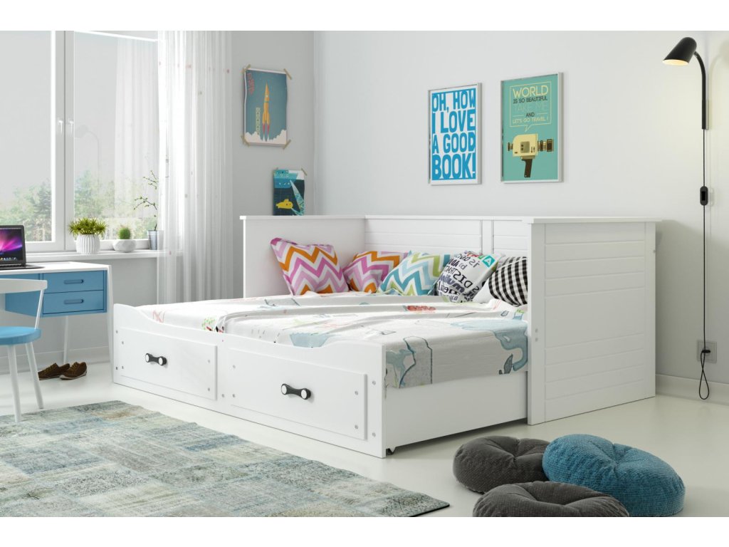 Dřevěná rozkládací postel Harwig je vhodná zejména pro ty, kteří s potýkají s menším prostorem. Je vhodná do dětských, studentských, nebo hostinských pokojů. Přes den slouží jako pohovka k sezení a v noci jako pohodlné a prostorné prostorné lůžko na spaní. V případě potřeby lze postel rozložit a vznikne tak prostorné dvoulůžko o velikosti 160x200 cm. Součástí postele jsou také praktické úložné prostory ve formě zásuvek. Postel je vyrobena z MDF a lamina a nabízíme ji ve dvou barevných provedeních - bílá a grafit. Tloušťka matrace je 9 cm. Postel je dodávaná v demontu. Součástí balení je montážní návod, včetně všech potřebných spojovacích prvků. Cena postele je uvedena včetně dvou matrací 80x200x8 cm. Ostatní vyobrazené doplňky a dekorace nejsou v ceně postele.