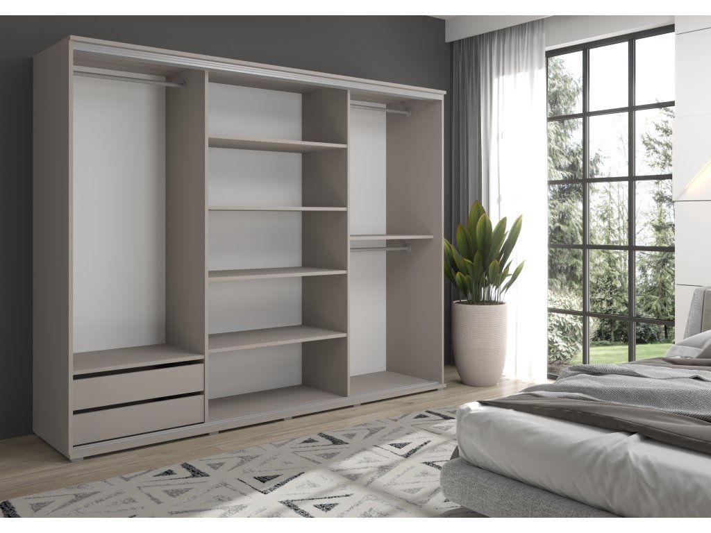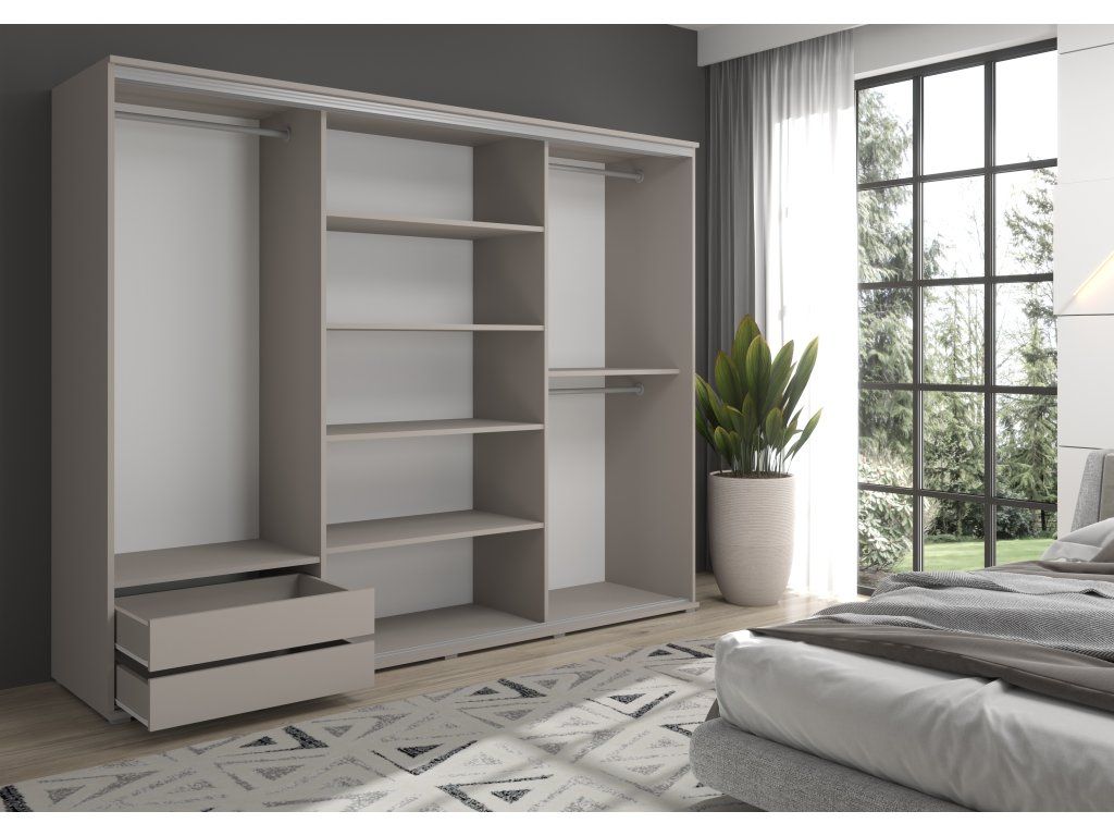 Posuvná šatní skříň Lago má police na oblečení, dvě kratší závěsné tyče a jednu tyč pro delší předměty, jako jsou šaty a kabáty. Skříň lze navíc vybavit sadou zásuvek. Promyšlené vnitřní uspořádání umožňuje pohodlné uložení různých kusů oblečení.