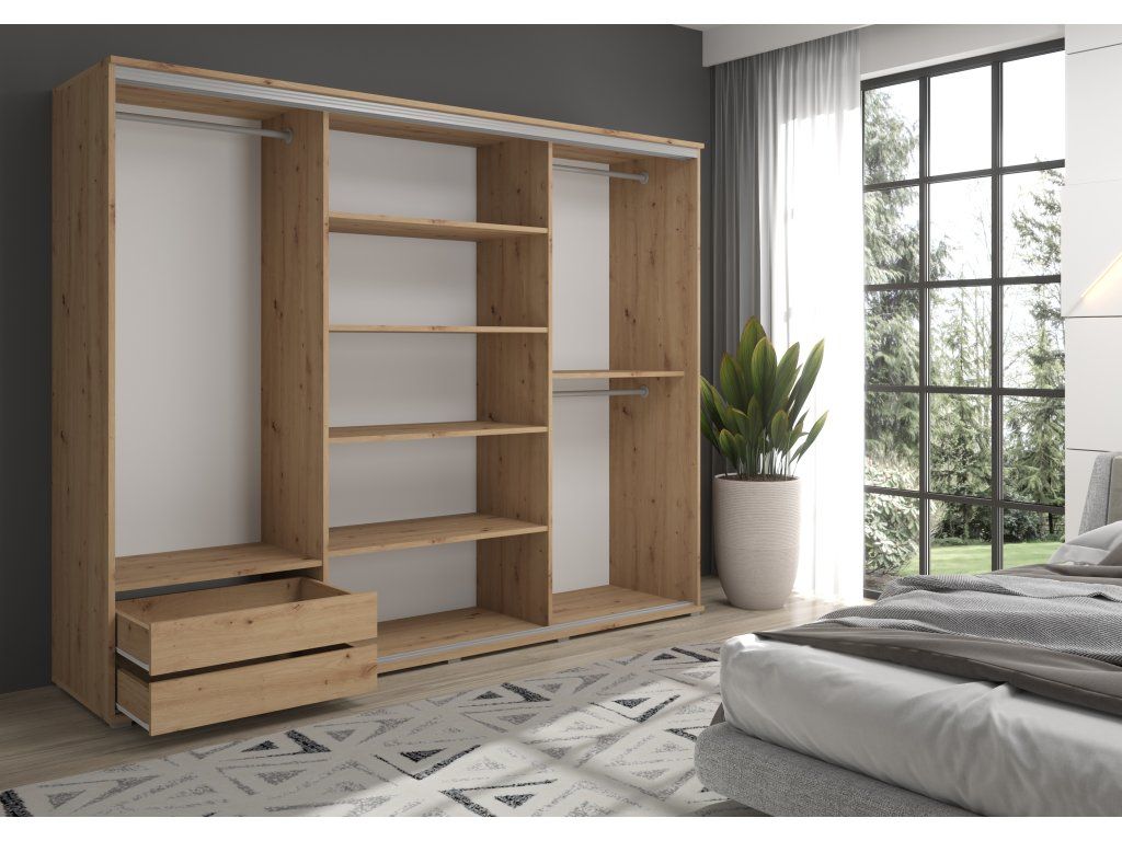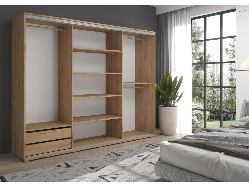 Posuvná šatní skříň Lago má police na oblečení, dvě kratší závěsné tyče a jednu tyč pro delší předměty, jako jsou šaty a kabáty. Skříň lze navíc vybavit sadou zásuvek. Promyšlené vnitřní uspořádání umožňuje pohodlné uložení různých kusů oblečení.
