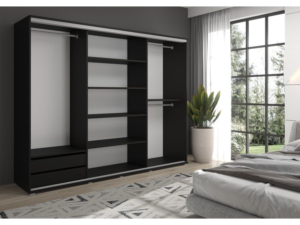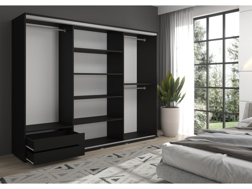 Posuvná šatní skříň Lago má police na oblečení, dvě kratší závěsné tyče a jednu tyč pro delší předměty, jako jsou šaty a kabáty. Skříň lze navíc vybavit sadou zásuvek. Promyšlené vnitřní uspořádání umožňuje pohodlné uložení různých kusů oblečení.