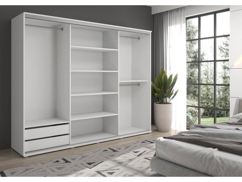 Posuvná šatní skříň Lago má police na oblečení, dvě kratší závěsné tyče a jednu tyč pro delší předměty, jako jsou šaty a kabáty. Skříň lze navíc vybavit sadou zásuvek. Promyšlené vnitřní uspořádání umožňuje pohodlné uložení různých kusů oblečení.