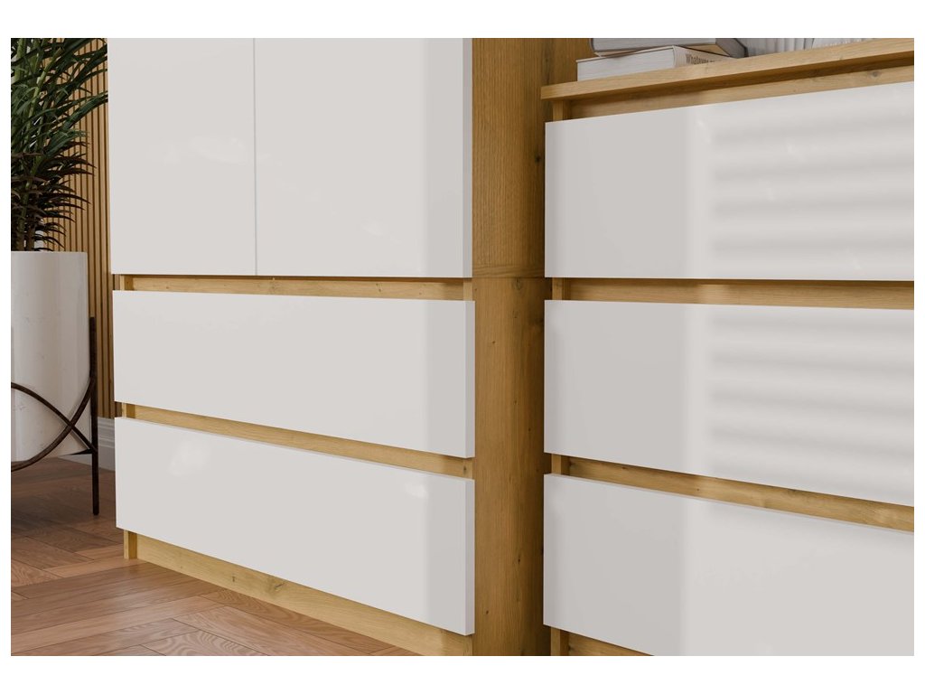 Šatní skříň Malvína v trendy barvách a moderním designu je praktický kus nábytku, který najde své uplatnění v ložnici, dětském pokoji, ale také v kanceláři nebo domácí pracovně. Nabízí dostatek úložného prostoru s možností instalace polic nebo šatní tyče v závislosti na vašich požadavcích. Dvířka se systémem TIP-ON se otevírají po jemném zatlačení čela dvířek. Nábytek je vyroben z nejkvalitnější laminované desky odolné proti poškrábání a vlhkosti, hrany jsou zakončené ABS materiálem.