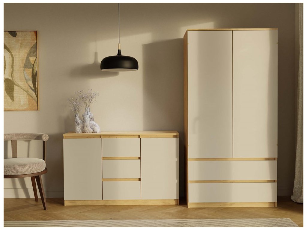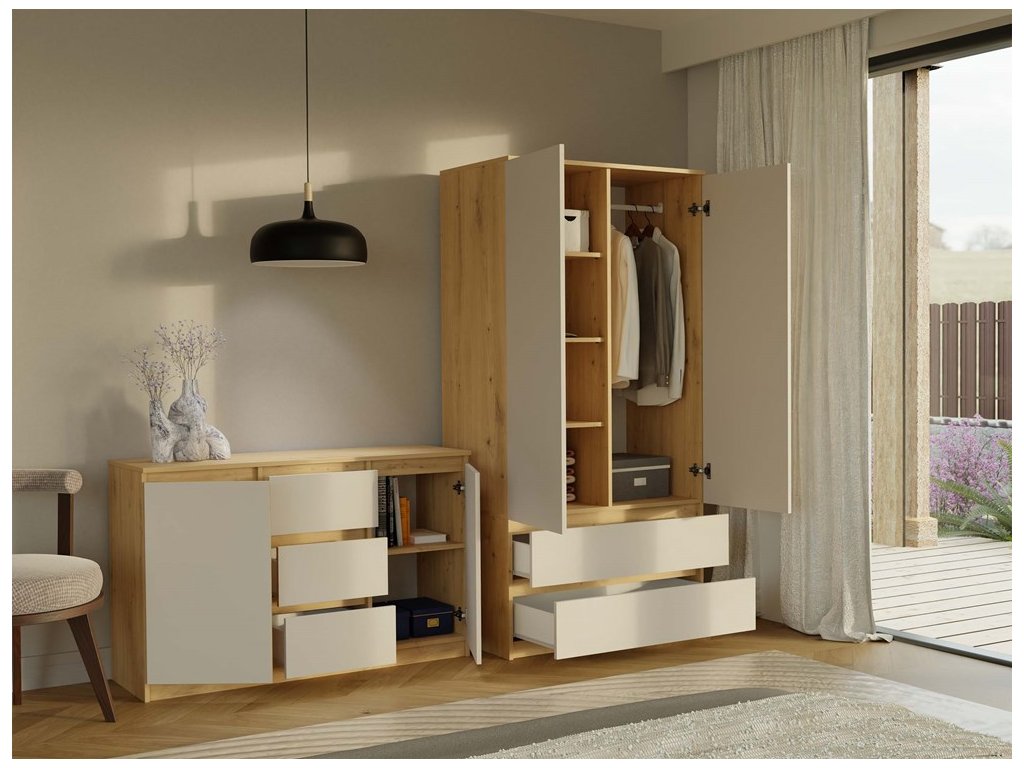 Šatní skříň Malvína v trendy barvách a moderním designu je praktický kus nábytku, který najde své uplatnění v ložnici, dětském pokoji, ale také v kanceláři nebo domácí pracovně. Nabízí dostatek úložného prostoru s možností instalace polic nebo šatní tyče v závislosti na vašich požadavcích. Dvířka se systémem TIP-ON se otevírají po jemném zatlačení čela dvířek. Nábytek je vyroben z nejkvalitnější laminované desky odolné proti poškrábání a vlhkosti, hrany jsou zakončené ABS materiálem.