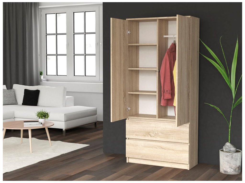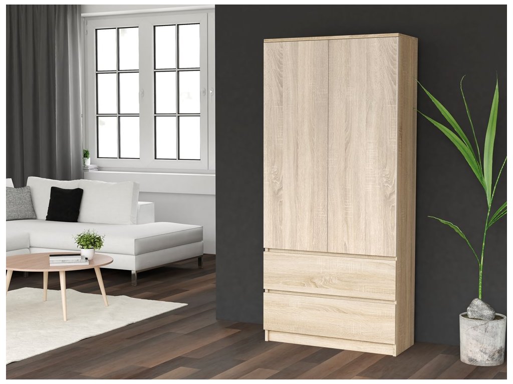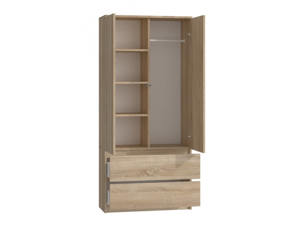 Šatní skříň Malvína v trendy barvách a moderním designu je praktický kus nábytku, který najde své uplatnění v ložnici, dětském pokoji, ale také v kanceláři nebo domácí pracovně. Nabízí dostatek úložného prostoru s možností instalace polic nebo šatní tyče v závislosti na vašich požadavcích. Dvířka se systémem TIP-ON se otevírají po jemném zatlačení čela dvířek. Nábytek je vyroben z nejkvalitnější laminované desky odolné proti poškrábání a vlhkosti, hrany jsou zakončené ABS materiálem.