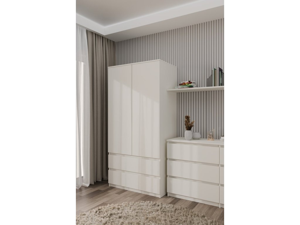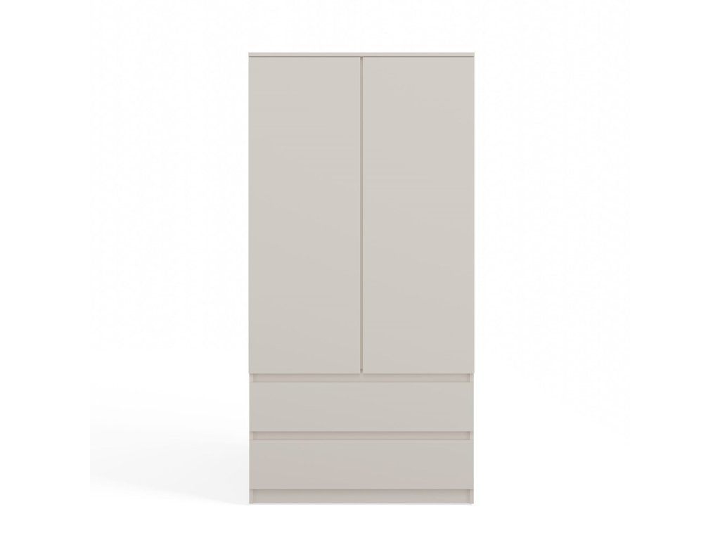 Šatní skříň Malvína v trendy barvách a moderním designu je praktický kus nábytku, který najde své uplatnění v ložnici, dětském pokoji, ale také v kanceláři nebo domácí pracovně. Nabízí dostatek úložného prostoru s možností instalace polic nebo šatní tyče v závislosti na vašich požadavcích. Dvířka se systémem TIP-ON se otevírají po jemném zatlačení čela dvířek. Nábytek je vyroben z nejkvalitnější laminované desky odolné proti poškrábání a vlhkosti, hrany jsou zakončené ABS materiálem.