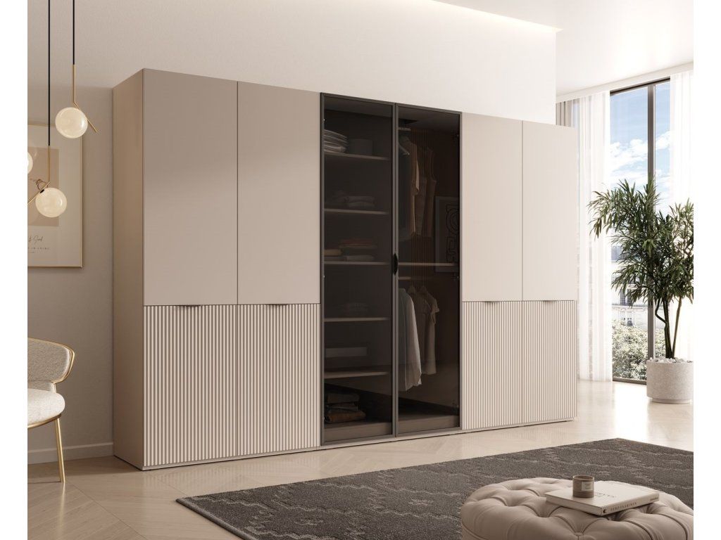 Kolekce SANDBOX představuje moderní a vysoce variabilní systém šatních skříní, který sází na minimalistický design, tmavé korpusy a kombinaci různých textur předních ploch. Systém je unikátní možností výběru ze čtyř různých stylů dveří, které zcela změní vzhled skříně. Skříně jsou modulární. Můžete je řadit vedle sebe a kombinovat různé typy dveří (např. kombinace dřevěného dekoru Sento a skla Antisol). Jako volitelné příslušenství je k dispozici LED osvětlení, které vynikne zejména u prosklených variant (Antisol/Flutes). Pokud chcete, aby místnost působila luxusně, doporučuji kombinaci dvou plných skříní (Nova/Sento) po stranách a jedné prosklené (Flutes) uprostřed s LED podsvícením.