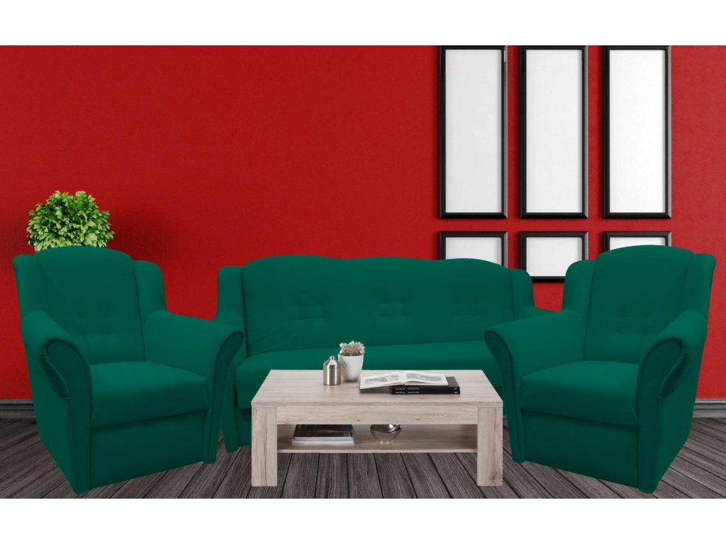 Agata je stále velmi oblíbeným klasickým modelem sedací soupravy v provedení 3F+1+1. Je velmi pohodlná a zároveň praktická. Sedací souprava je rozkládací a samozřejmostí je i úložný prostor. Jednoduchým rozkladem pomocí systému "klik klak" vznikne lůžko k příležitostnému přespání Vaší návštěvy. Sedací souprava je potažena kvalitní látkou Matt Velvet a nabízíme ji v několika barvách, ze kterých si určitě vyberete tu nejvhodnější pro Váš obývací pokoj. Textilie Mat Velvet je vyrobená ze 100% polyesteru. Mimořádně jemná struktura, hebkost, nadýchanost a trvanlivost charakterizují tuto látku. Tkanina Mat Velvet spojuje nadčasový design a funkčnost. Navíc vyniká speciální povrchovou úpravou „Water Repellent“. Výplň sedáků tvoří pružiny v kombinaci s kvalitní PUR pěnou. Tato kombinace zajistí velmi pohodlné sezení. Cena sedací soupravy je uvedena za rozkládací trojsed a dvě křesla. Tuto sedací soupravu lze objednat v jakékoliv látce ze vzorníku, který je vyobrazen v doplňkových fotografiích. V případě zájmu nás kontaktujte.