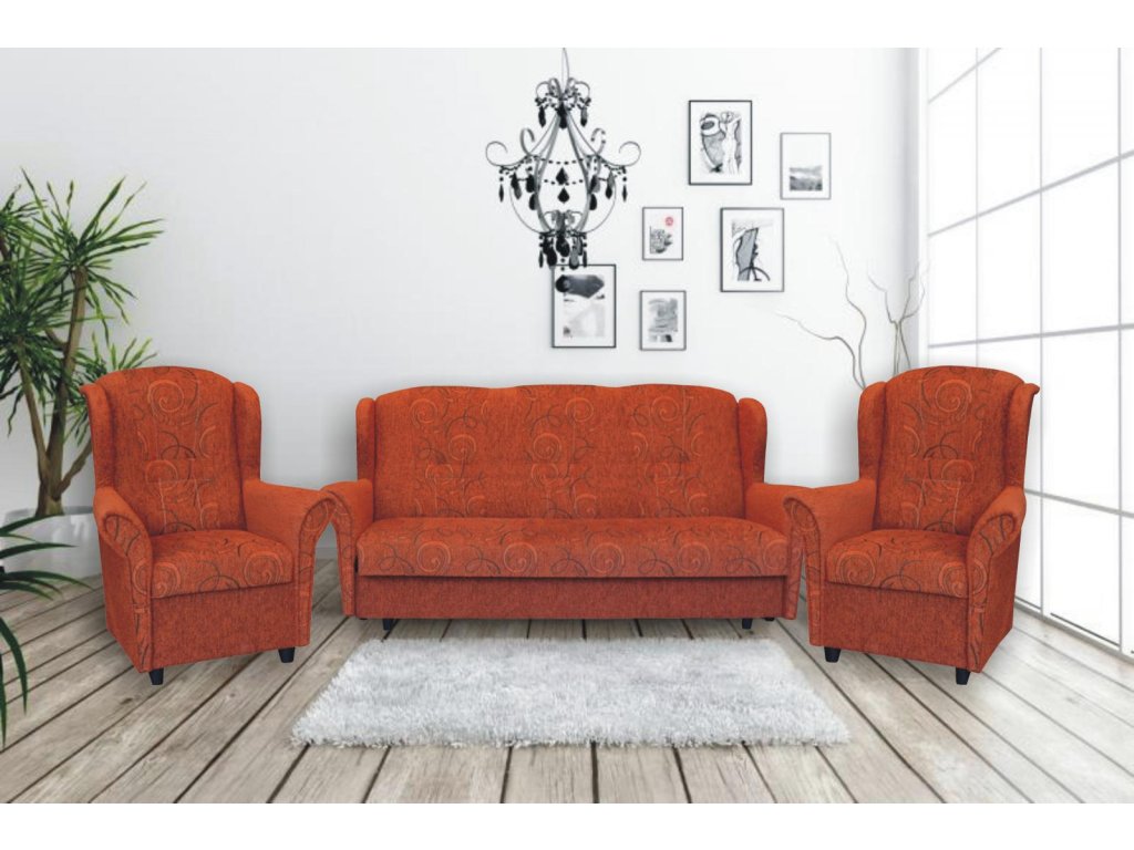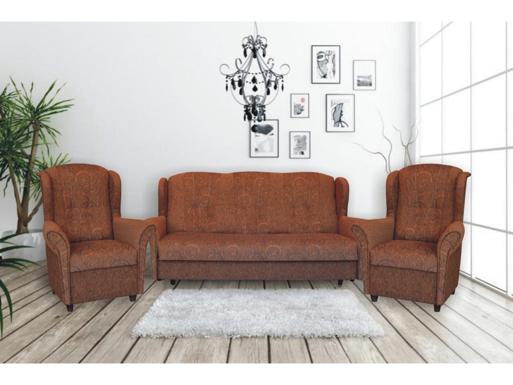Sedací souprava Agáta MAX je stále velmi oblíbeným klasickým modelem sedací soupravy v provedení 3F+1+1. Je velmi pohodlná a zároveň praktická. Sedací souprava je rozkládací a samozřejmostí je i úložný prostor, který můžete využít např.na lůžkoviny. Jednoduchým rozkladem pomocí systému "klik klak" vznikne lůžko k příležitostnému přespání Vaší návštěvy. Sedací souprava je potažena kvalitní látkou, v kombinaci vzoru a jednobarevné látky. Výpň sedáků tvoří pružiny v kombinaci s kvalitní PUR pěnou. Tato kombinace ve spojení s extra vysokou opěrkou zad, je zárukou pohodlného sezení. Cena sedací soupravy je uvedena za rozkládací trojsed a dvě křesla. Vyobrazené doplňky a dekorace nejsou v ceně. Sedací souprava bude dodaná v potahové látce, která je vyobrazena na úvodní fotografii. V doplňkových fotografiích jsou vyobrazeny další možné varianty.