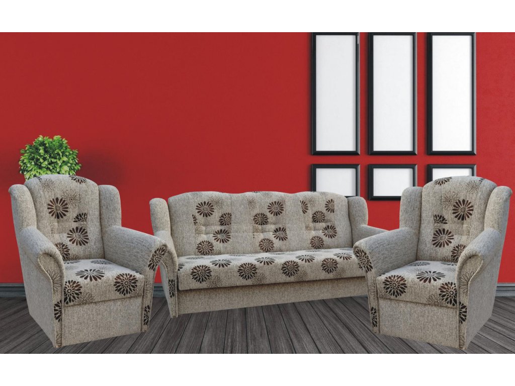 Klasická rozkládací sedací souprava vhodná také do menších bytů. Sedací souprava má praktický úložný prostor a jednoduchým rozkladem vznikne lůžko vhodné k příležitostnému spaní. Sedací souprava je pružinová v kombinaci s kvalitní PUR pěnou. Sedací souprava se skládá z rozkládacího trojsedu a dvou křesel. Tato sedačka je očalouněná kvalitní potahovou látkou, snadno čistitelnou suchou pěnou.