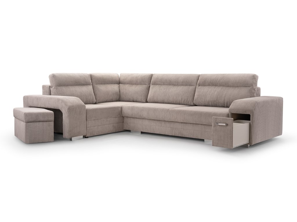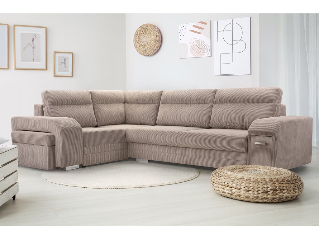 Sedací souprava Alvin v moderním designu v sobě spojuje 2 důležité prvky, které nesmí chybět žádné sedací soupravě. Jsou to pohodlí a praktičnost. Praktickou stránkou této sedací soupravy je možnost rozložení pro příležitostné přespání návštěvy a nepostradatelné úložné prostory. Úložný prostor s univerzálním využitím najdete v područi, dále v taburetu, který je možno zasunout do druhé područe a samořejmostí je i úložný prostor v sedací soupravě. Jsou dva a využijete je např. na lůžkoviny. Výplň sedáků tvoří kombinace pružin s kvalitní PUR pěnou. Tato kombinace spolu s velkými opěrnými polštáři, zajišťuje pohodlí. Sedací souprava je celočalouněná a můžete jí umístit také do prostoru. Sedací soupravu nabízíme v levém i pravém provedení a v několika oblíbených barvách i látkách.