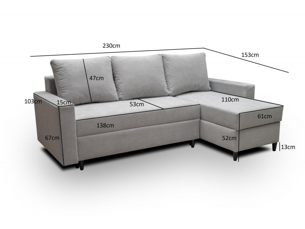 Carine je moderní rohová sedací souprava s nadčasovým designem. Její předností je pohodlí, praktičnost a univerzální použití. Můžete si ji podle potřeby sestavit jako levou nebo pravou, což je výhoda při zařizování obývacího pokoje. Nemusíte přemýšlet do jakého rohu postavíte sedací soupravu, jednoduše ji podle potřeby přizpůsobíte. Pohodlí při sezení zajišťuje kombinace pružin bonell s kvalitní PUR pěnou a velké opěrné polštáře, které jsou odnímatelné, takže si je můžete přizpůsobit svým potřebám. Praktickou stránkou sedací soupravy je úložný prostor a možnost rozložení k občasnému přespání Vaší návštěvy. Sedací souprava je potažena kvalitní látkou Mellow a nabízíme ji v několika odstínech. Správná barva sedací soupravy je vyobrazena v úvodních fotografiích. Ostatní fotografie jsou ilustrační.