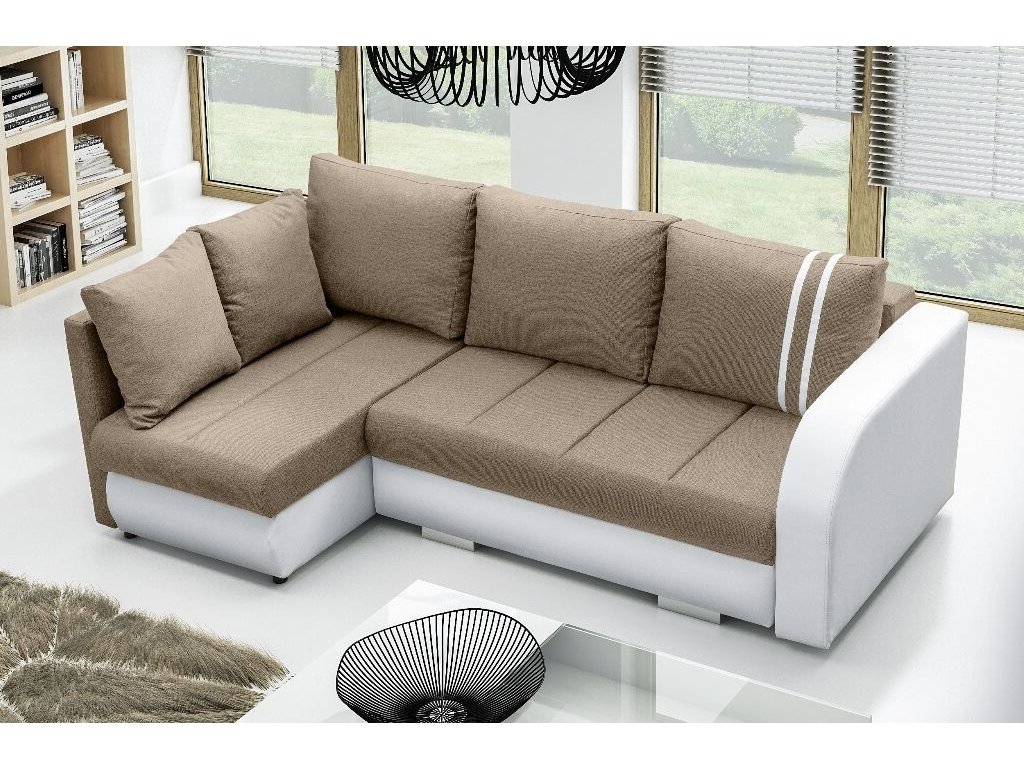 Rohová sedací souprava Citizen, je vzhledem ke svým rozměrům, vhodná do menších pokojů. Sedací souprava je rozkládací a má také 2 praktické úložné prostory. Jednoduchým rozložením vznikne dostatečně velké lůžko vhodné k příležitostnému spaní. Výplň sedáku tvoří kombinace pružin faliste s kvalitní PUR pěnou. Tato kombinace zajistí pohodlné sezení. Sedací souprava je potažena kvalitní látkou v kombinaci s bílou EKO kůží. Tuto sedačku nabízíme v několika barevných variantách. V ceně sedací soupravy je 5 opěrných polštářů. Ostatní vyobrazené dekorace nejsou v ceně.