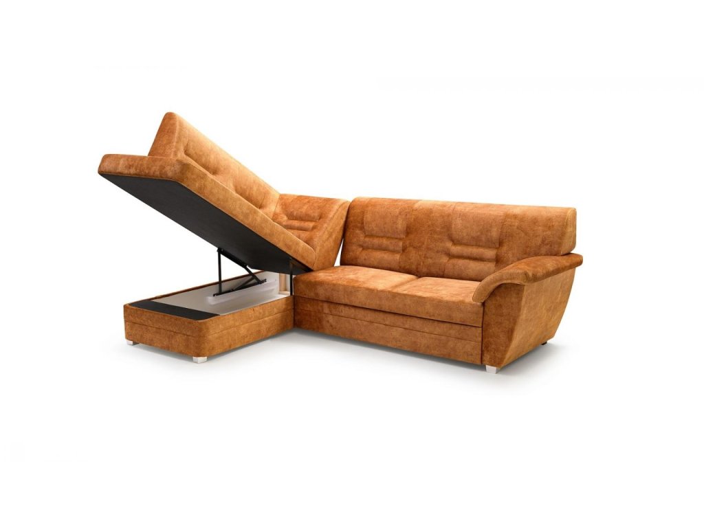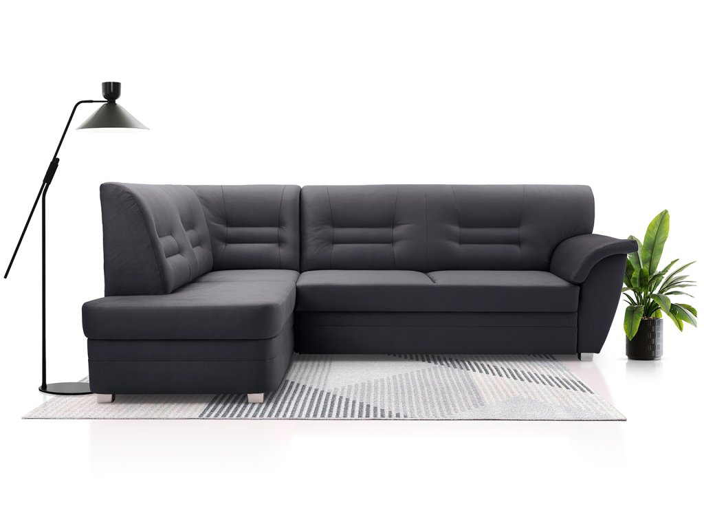 Moderní, rohová sedací souprava Dornia je rozkládací. Jednoduchým rozkladem vzniká lůžko vhodné k příležitostnému spaní. Má uložný prostor, který lze využít například na lůžkoviny. Sedací souprava je pružinová v kombinaci s kvalitní PUR pěnou. Je celočalouněná a je možno ji umístit také do prostoru. Na úvodním obrázku je sedací souprava vyobrazena v pravém provedení. Správná barva je zobrazena na první fotografii. Ostaní fotografie jsou pouze ilustrační. Vyobrazené doplňky a dekorace nejsou v ceně.