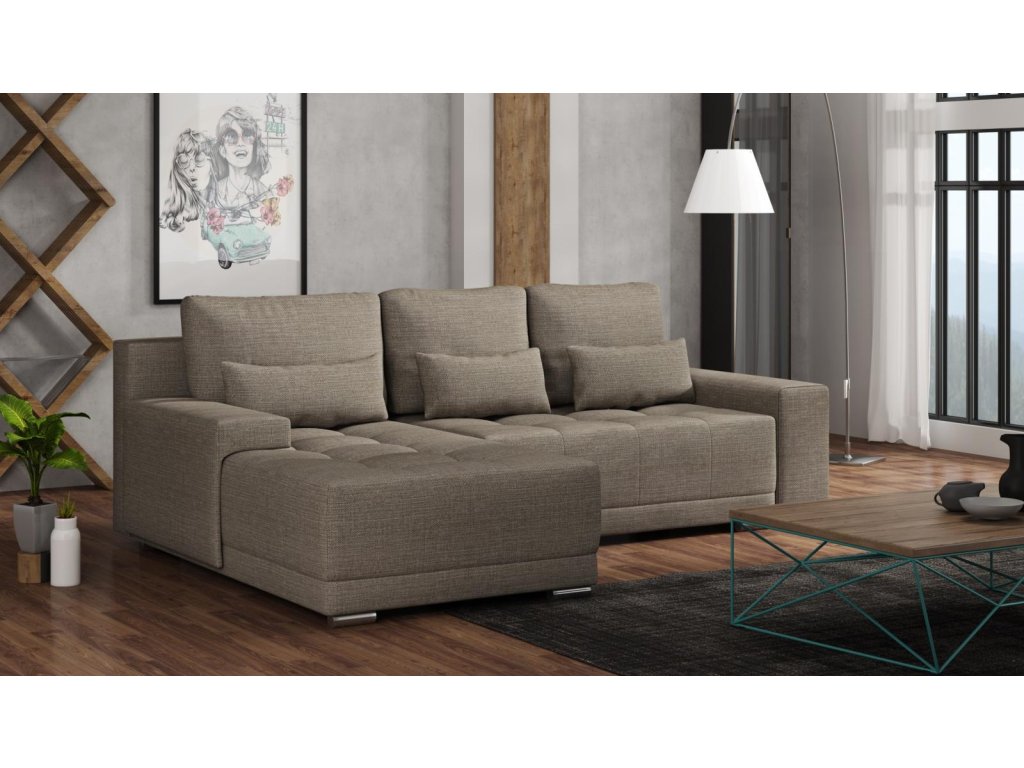Sedací souprava Lacom výborně zapadne do moderního i klasického interiéru. Její velkou předností je pohodlí, praktičnost a univerzální použití. Tzn. že si ji můžete podle potřeby sestavit jako levou nebo pravou, což je výhoda při zařizování obývacího pokoje. Nemusíte přemýšlet do jakého rohu postavíte sedací soupravu, jednoduše ji podle potřeby přizpůsobíte. Sedací souprava je rozkládací a může tak sloužit k občasnému přespání Vaší návštěvy. Samozřejmostí je i praktický úložný prostor, který můžete využít např. na lůžkoviny. Sedací souprava je potažena kvalitní látkou a nabízíme ji v několika trendy odstínech. Výplň sedáků tvoří kombinace pružin s kvalitní PUR pěnou, což zajišťuje velmi pohodlné sezení. Součástí sedací soupravy jsou tři velké opěrné a tři malé dekorační polštáře. Vyobrazené doplňky a dekorace nejsou v ceně.