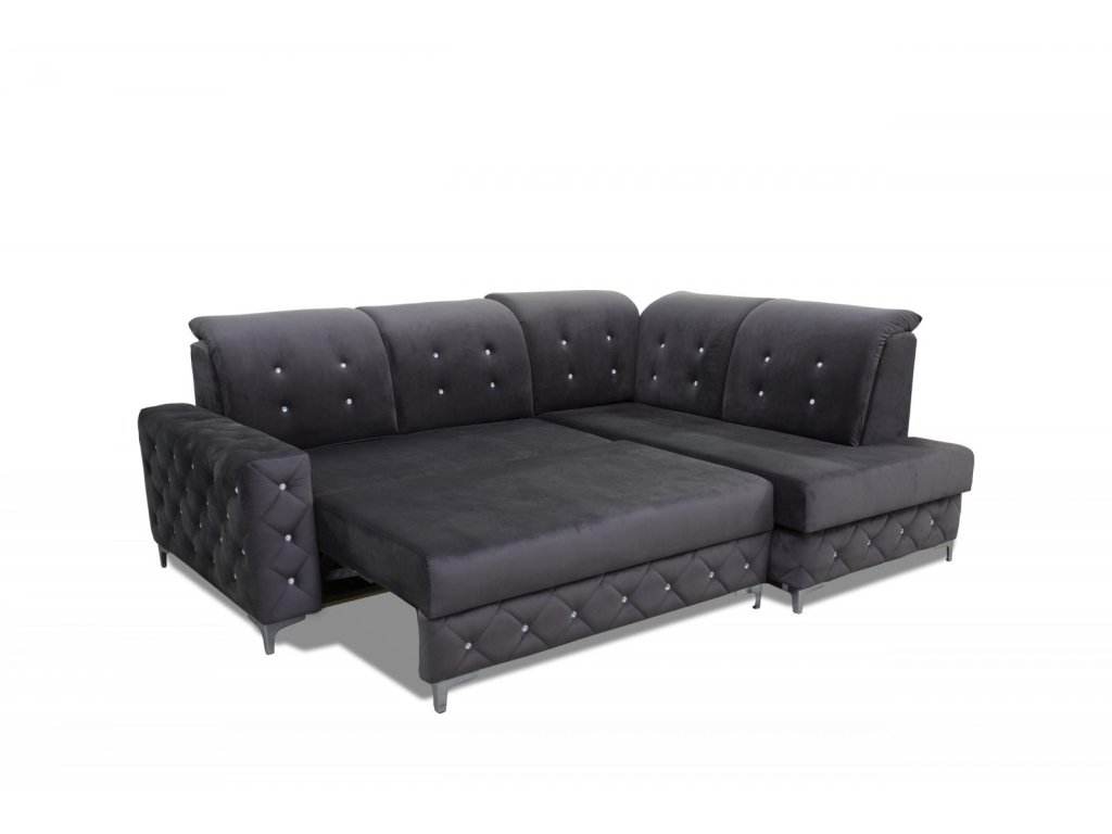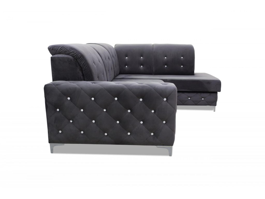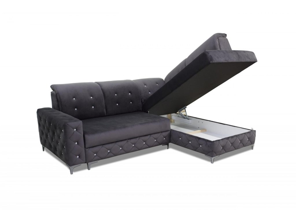 Designová sedací souprava v krásné kombinaci tmavě šedé látky a ozdobného prošití s krystalky.. Sedačka je vyrobena z pružin v kombinaci s kvalitní PUR pěnou. Sedačka je rozkládací s praktickým úložným prostorem. Třpytivé krystalky jí dodávají na jedinečnosti a bude se vyjímat v každém interiéru. Sedací souprava je požena kvalitní potahovou látkou Monolith, která vyniká speciální povrchovou úpravou "Water repellent". Ta chrání povrch textilie před rychlým prosakováním tekutin. Sedací soupravu nabízíme v levém i pravém provedení.
