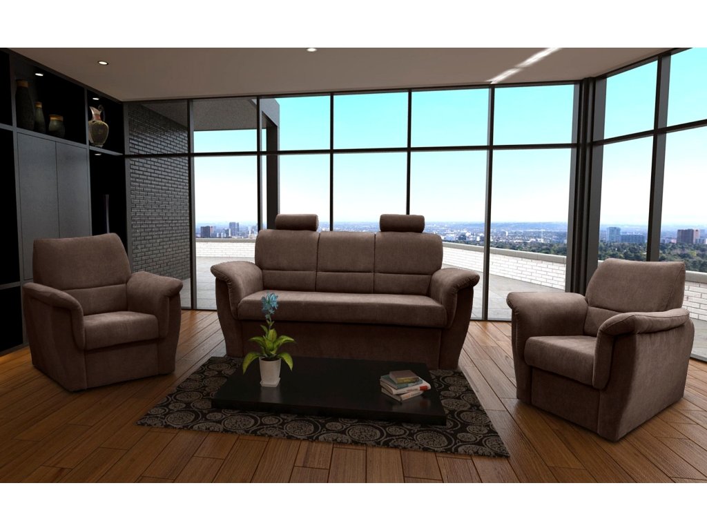 Sedací souprava Nadia vyniká svým elegantním vzhledem a praktičností. Je rozkládací a úložný prostor najdete jak v pohovce, tak v obou křeslech. Jednoduchým rozkladem vynikne lůžko k příležitostnému přespání. Výplň sedáků tvoří pružiny bonell s kvalitní PUR pěnou. Tato kombinace zajistí velmi pohodlné sezení. V ceně pohovky jsou 2 výškově nastavitelné opěrky hlavy, které podtrhnou komfort sezení. Ostatní vyobrazené dekorace nejsou v ceně.
