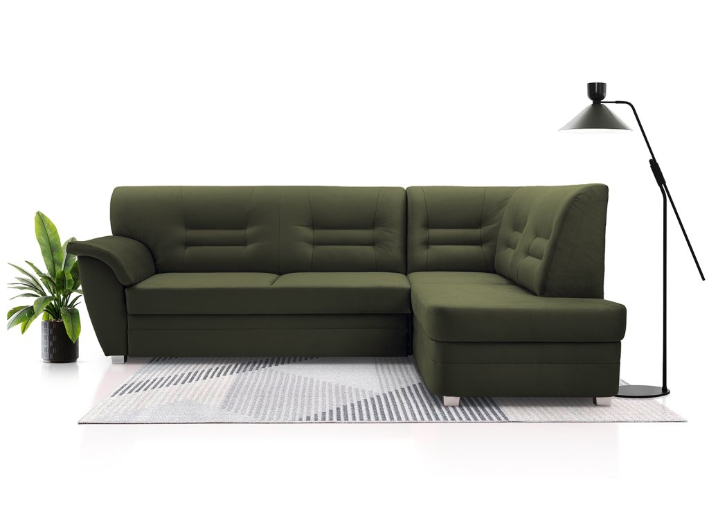 Moderní, rohová sedací souprava Dornia je rozkládací. Jednoduchým rozkladem vzniká lůžko vhodné k příležitostnému spaní. Má uložný prostor, který lze využít například na lůžkoviny. Sedací souprava je pružinová v kombinaci s kvalitní PUR pěnou. Je celočalouněná a je možno ji umístit také do prostoru. Na úvodním obrázku je sedací souprava vyobrazena v pravém provedení. Správná barva je zobrazena na první fotografii. Ostaní fotografie jsou pouze ilustrační. Vyobrazené doplňky a dekorace nejsou v ceně.