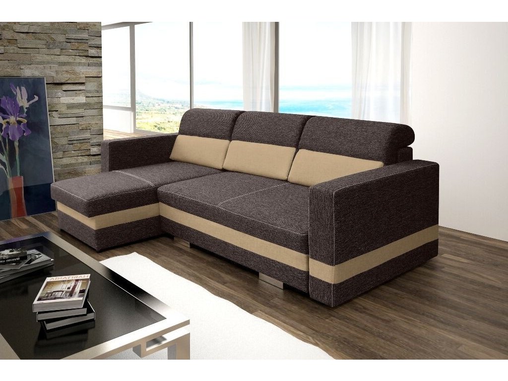 Elegantní rohová sedací souprava Rimini je rozkládací a má také 2 praktické úložné prostory. Díky svým rozměrům je vhodná i do menších pokojů. Jednoduchým rozložením pomocí automatu, vznikne dostatečně velké lůžko vhodné k příležitostnému spaní. Výplň sedáku tvoří kombinace pružin bonell s kvalitní PUR pěnou. Tato kombinace zajistí velmi pohodlné sezení. Sedací souprava je potažena kvalitní látkou v kombinaci 2 barev, a to v několika odstínech. V ceně sedací soupravy jsou 3 velké opěrné polštáře. Ostatní vyobrazené dekorace nejsou v ceně.