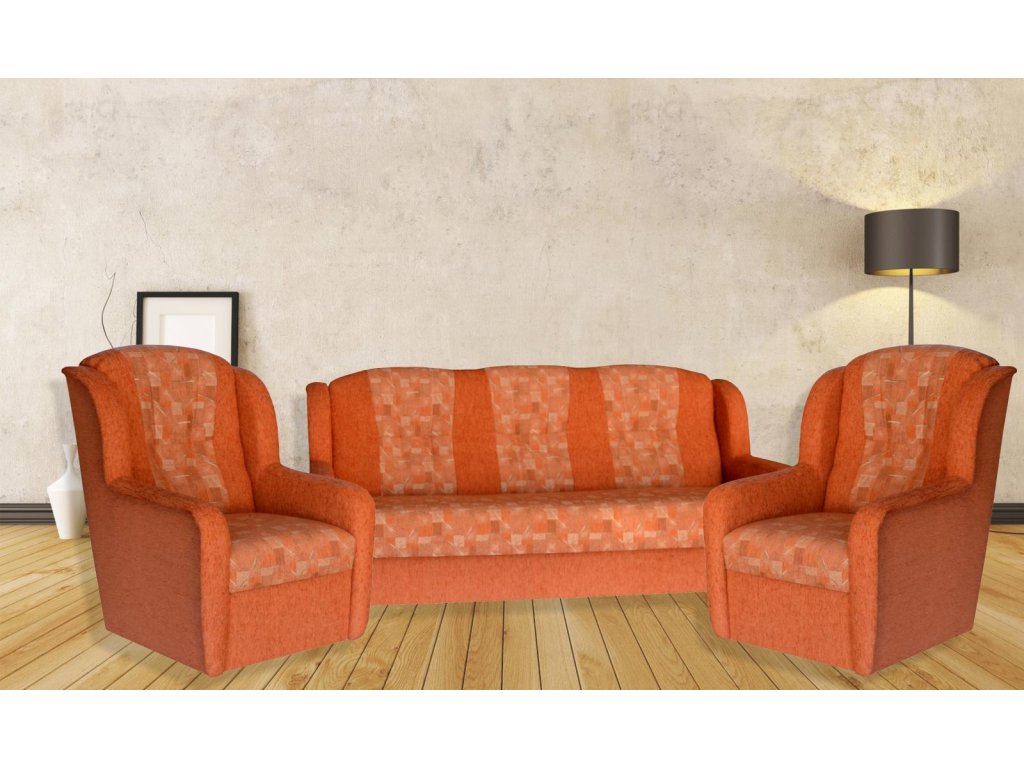 Ušák je stále velmi oblíbeným klasickým modelem sedací soupravy v provedení 3F+1+1. Je velmi pohodlná a zároveň praktická. Sedací souprava je rozkládací a samozřejmostí je i úložný prostor. Jednoduchým rozkladem pomocí systému "klik klak" vznikne lůžko k příležitostnému přespání Vaší návštěvy. Sedací souprava je potažena kvalitní látkou a nabízíme ji v několika barvách, ze kterých si určitě vyberete tu nejvhodnější pro Váš obývací pokoj. Výpň sedáků tvoří pružiny v kombinaci s kvalitní PUR pěnou. Tato kombinace zajistí velmi pohodlné sezení. Cena sedací soupravy je uvedena za rozkládací trojsed a dvě křesla.
