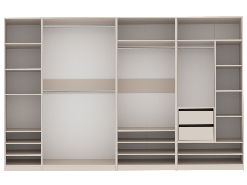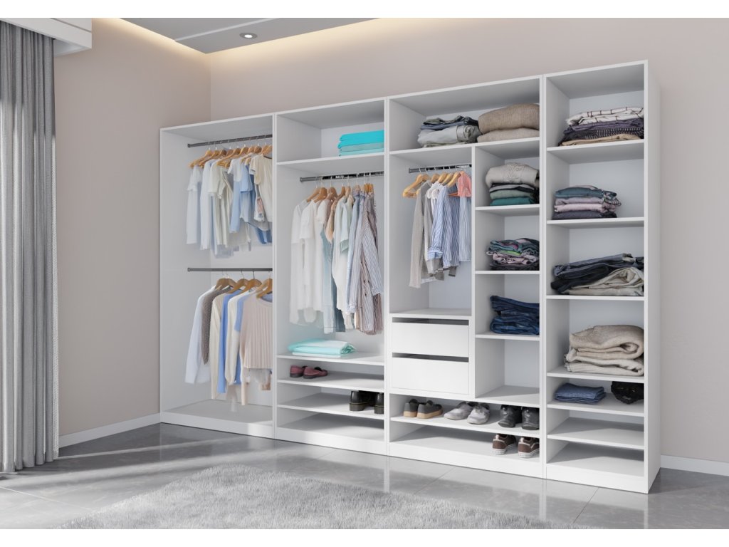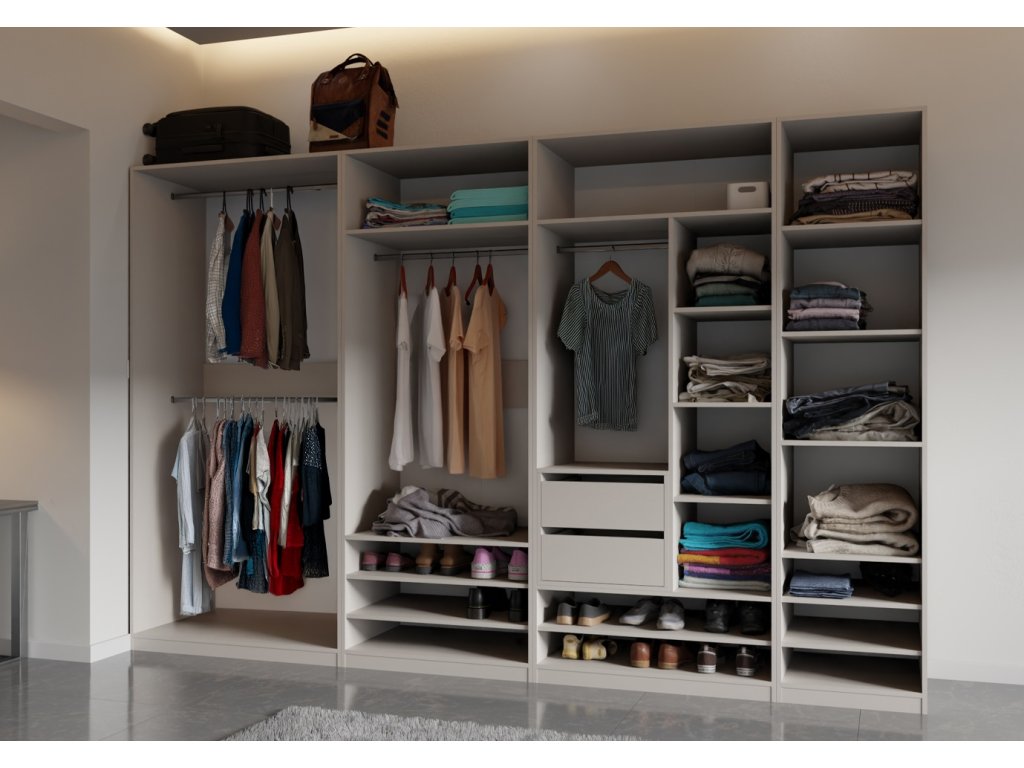 systém otevřených skříní, které jsou vhodné do ložnic, předsíní, dětských pokojů, pracoven, koupelen, případně i do garáží. Jsou cenově výhodnější, než klasické skříně.