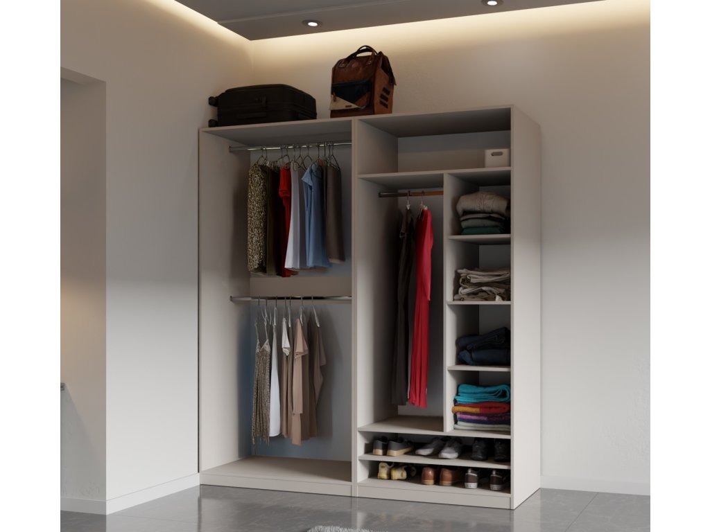 Systém otevřených skříní, které jsou vhodné do ložnic, předsíní, dětských pokojů, pracoven, koupelen, případně i do garáží. Jsou cenově výhodnější, než klasické skříně.