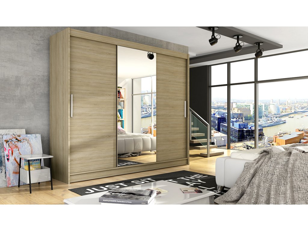 Skříň Astana s posuvnými dveřmi, je vyrobena z kvalitního lamina o síle 16 mm a hrany jsou ukončeny ABS lištou. Vodící lišty jsou vyrobeny z odolného hliníku a splňují požadavky pro každodenní užívání. Na prostředních dveřích skříně je nalepené zrcadlo, které místnost opticky zvětší a prosvětlí. Skříň nabízíme ve čtyřech odstínech. Díky svým rozměrům a uspořádání poskytuje dostatek úložného prostoru. Skříň je dodávána v demontu a součástí je montážní plánek včetně všech potřebných spojovacích materiálů. Vyobrazené dekorace nejsou v ceně. Skleněné zrcadlo je součástí skříně.