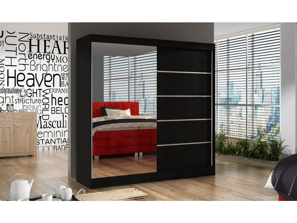 Skříň je vyrobena z kvalitního lamina. Díky svému vnitřnímu uspořádání nabízí dostatek úložného prostoru, posuvné dveře šetří prostor a zrcadlo ho opticky zvětšuje. Skříň je vhodná do ložnice, dětského nebo studentského pokoje, do předsíně i kanceláře. Vnitřní uspořádání skříně je vyobrazeno na fotografii. Skříň je dodávána v demontu. Součástí je i skleněné zrcadlo, které je nalepeno na jedné části dveří skříně a také montážní plánek včetně všech potřebných spojovacích materiálů. Vyobrazené dekorace nejsou v ceně.
