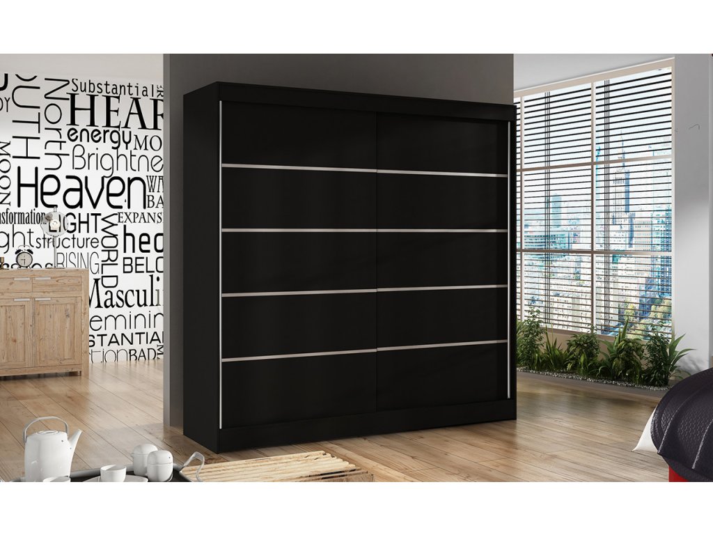 Skříň je vyrobena z kvalitního lamina. Díky svému vnitřnímu uspořádání nabízí dostatek úložného prostoru a posuvné dveře prostor šetří. Skříň je vhodná do ložnice, dětského nebo studentského pokoje, do předsíně i kanceláře. Vnitřní uspořádání skříně je vyobrazeno na fotografii. Skříň je dodávána v demontu a součástí je montážní plánek včetně všech potřebných spojovacích materiálů. Vyobrazené dekorace nejsou v ceně.