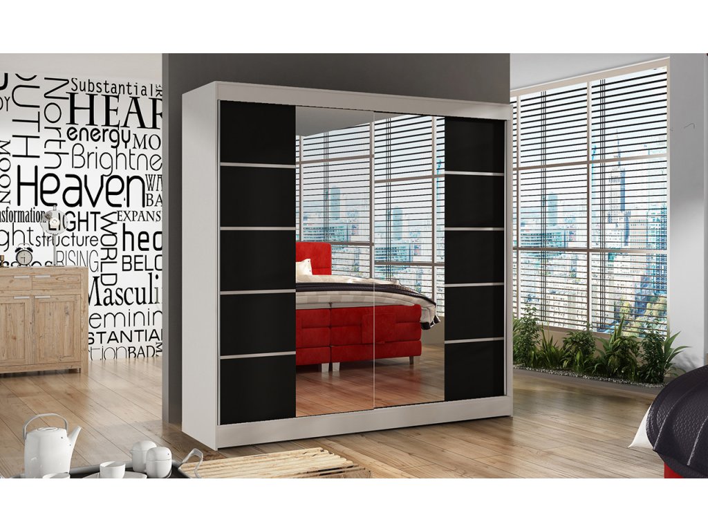 Skříň je vyrobena z kvalitního lamina. Díky svému vnitřnímu uspořádání nabízí dostatek úložného prostoru, posuvné dveře šetří prostor a zrcadlo ho opticky zvětšuje. Skříň je vhodná do ložnice, dětského nebo studentského pokoje, do předsíně i kanceláře. Vnitřní uspořádání skříně je vyobrazeno na fotografii. Skříň je dodávána v demontu. Součástí jsou i skleněná zrcadla, která jsou nalepena na dveřích skříně a také montážní plánek včetně všech potřebných spojovacích materiálů. Vyobrazené dekorace nejsou v ceně.